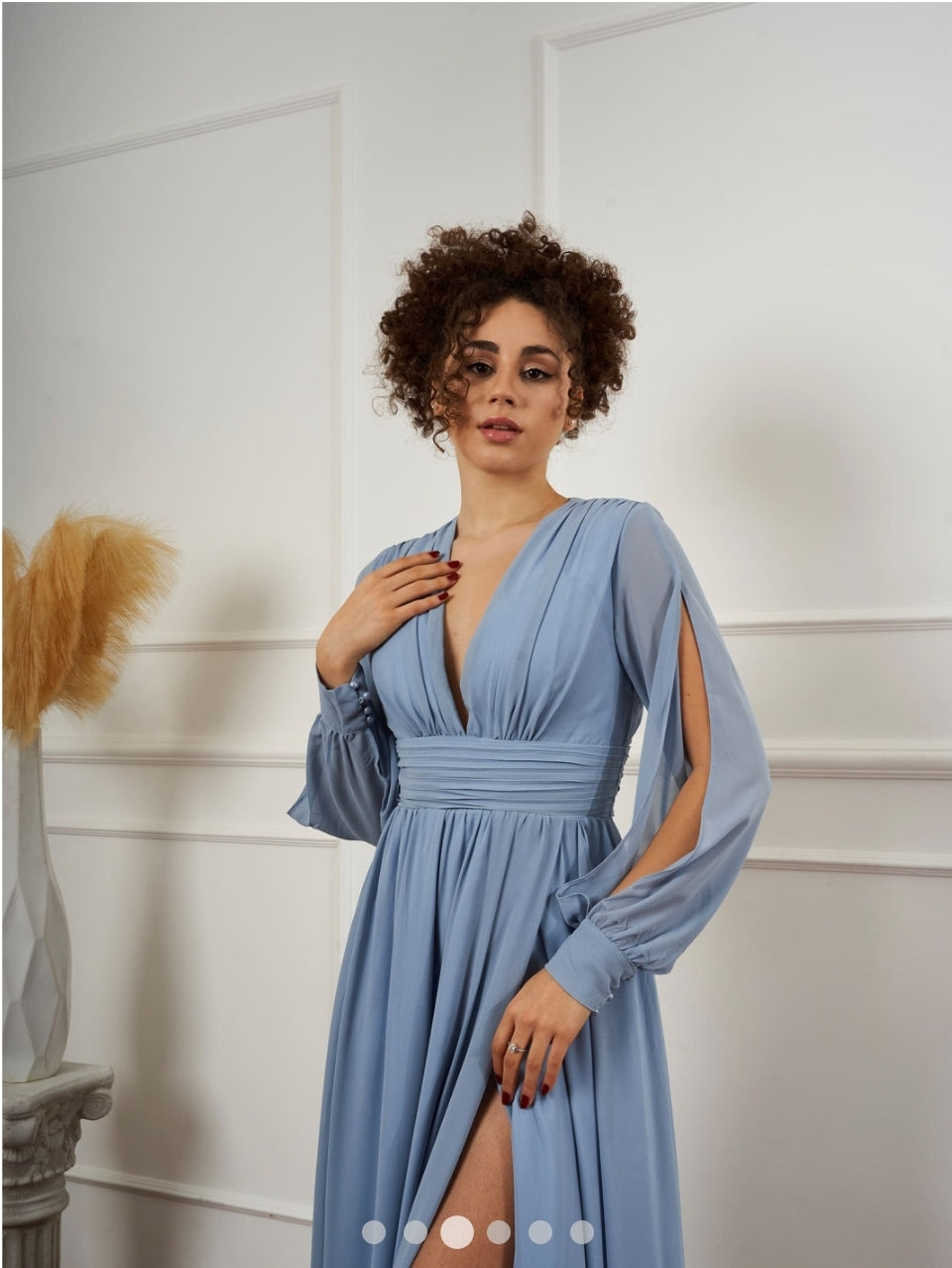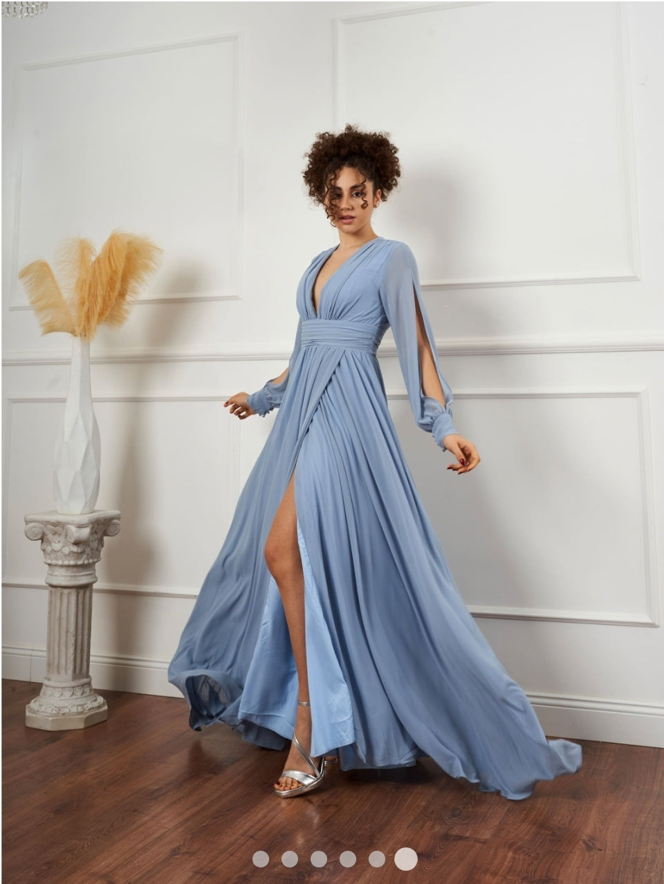 Modello: Abito stile impero con scollatura profonda a V sul davanti e sul dietro a manica lunga. Nel bustino ha le coppe preformate e la gonna parte dalla vita alta e presenta uno spacco laterale su una gamba molto profondo