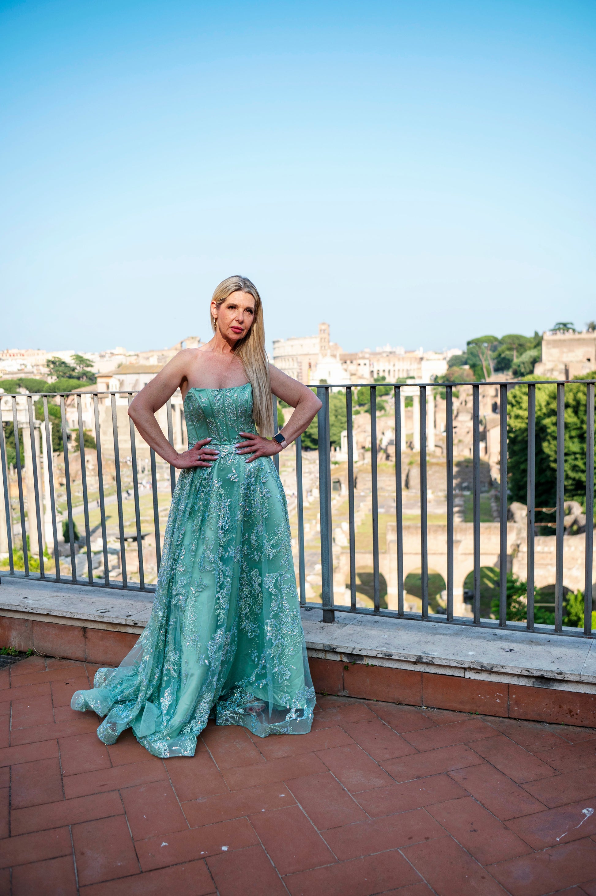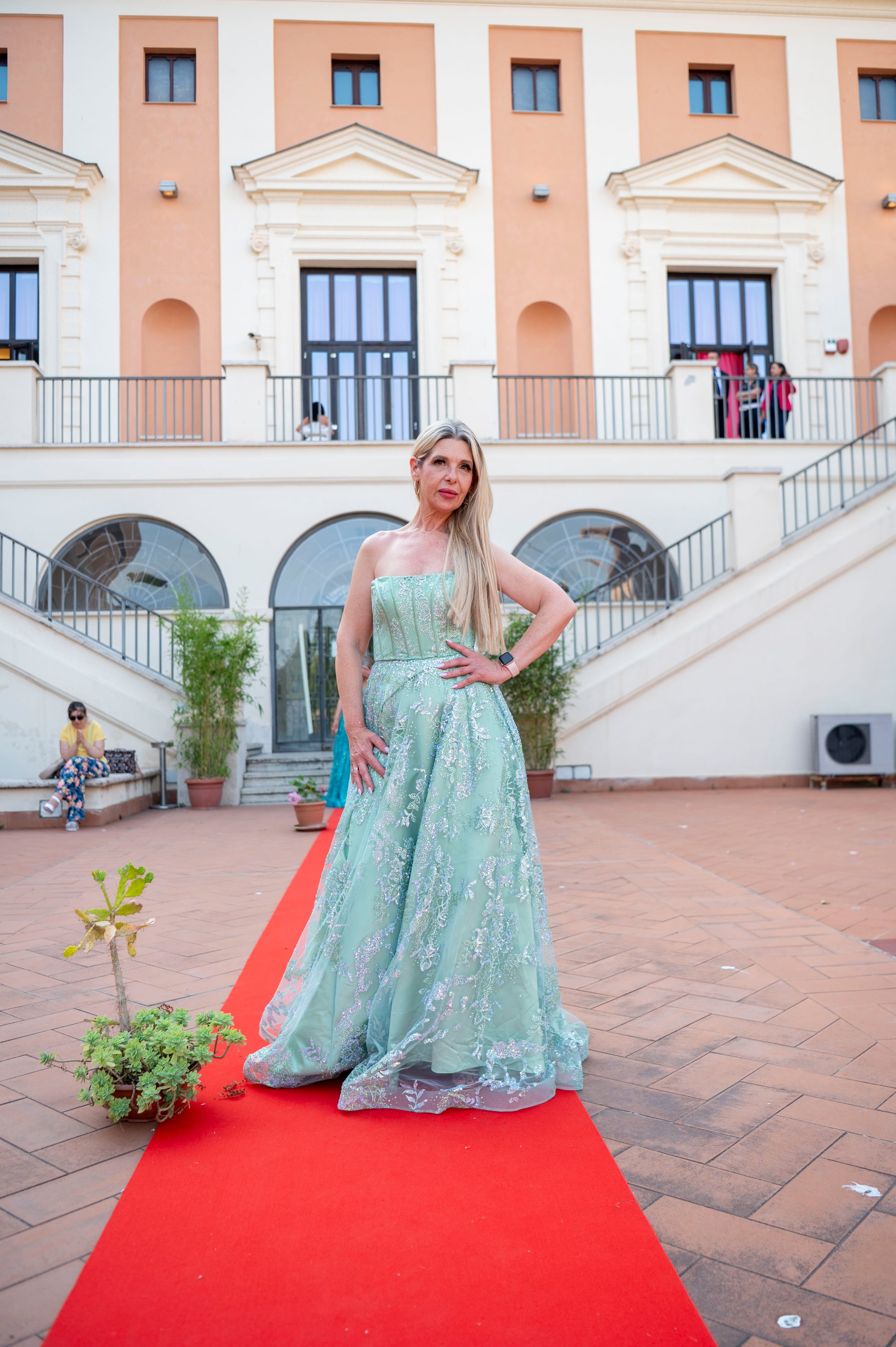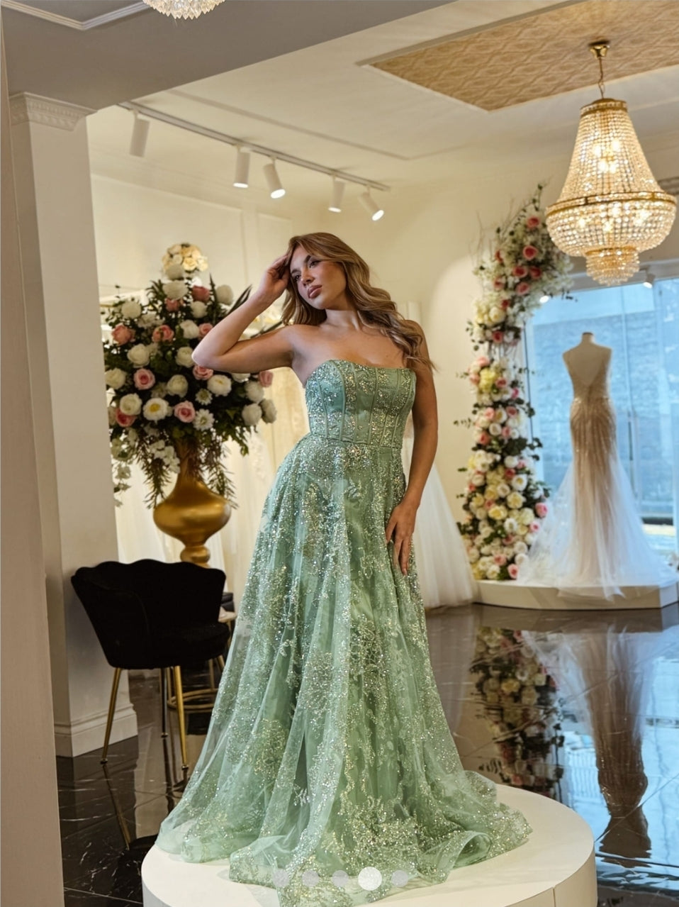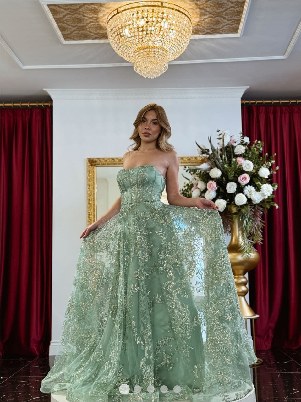 Modello: Abito fiabesco che unisce eleganza e luminosità in un perfetto equilibrio di dettagli preziosi. Il corpetto strutturato con stecche a vista scolpisce la figura, esaltando il décolleté con la sua linea senza spalline. Il tessuto ricamato con applicazioni scintillanti crea giochi di luce ad ogni movimento, mentre la gonna ampia e fluida avvolge la silhouette con leggerezza. Perfetto per chi desidera un look romantico ma di grande impatto scenico.