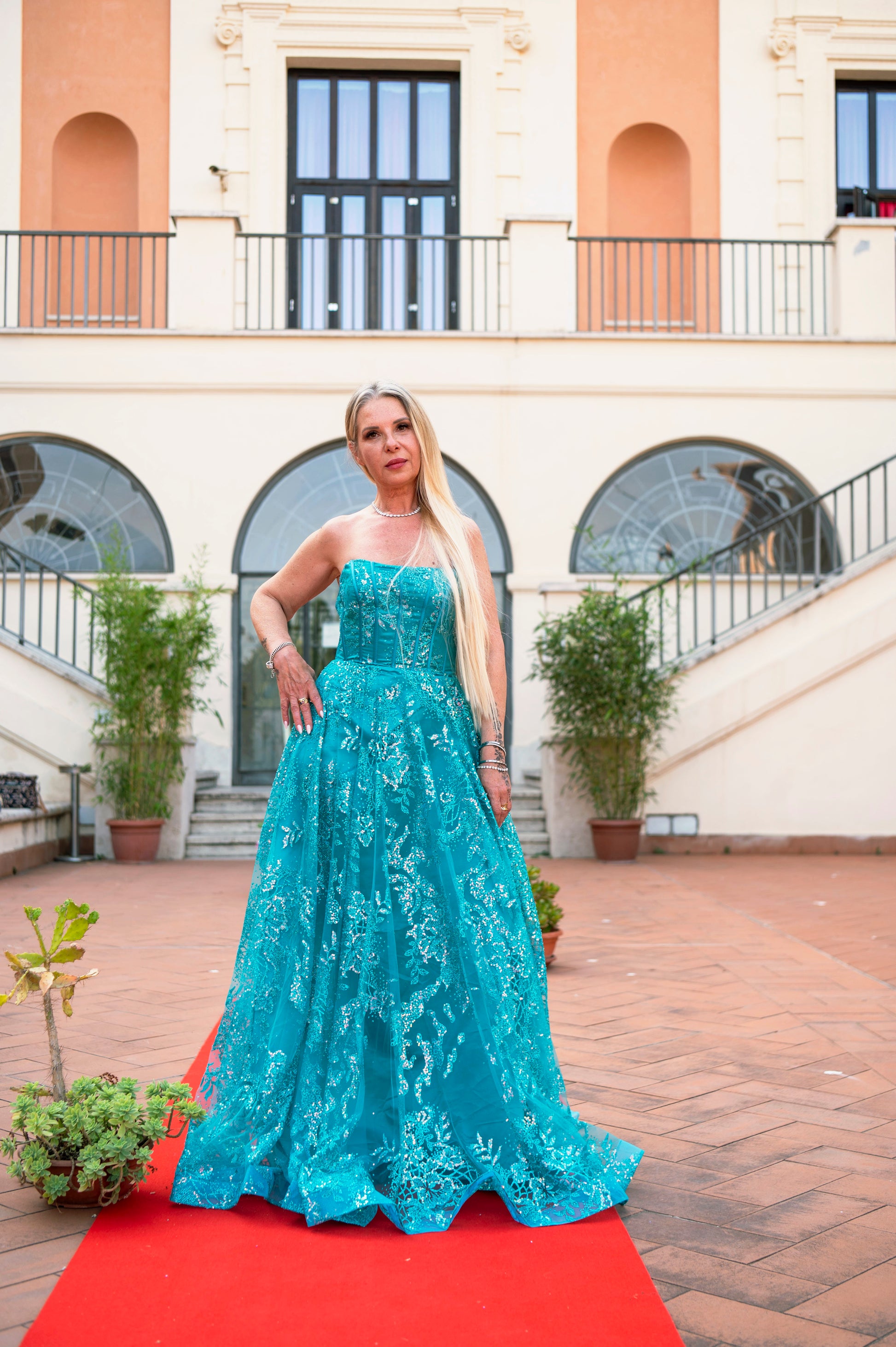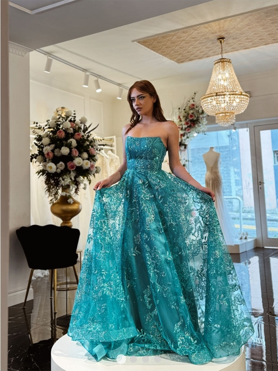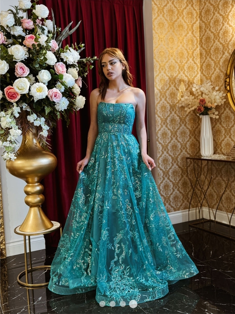 Modello: Abito fiabesco che unisce eleganza e luminosità in un perfetto equilibrio di dettagli preziosi. Il corpetto strutturato con stecche a vista scolpisce la figura, esaltando il décolleté con la sua linea senza spalline. Il tessuto ricamato con applicazioni scintillanti crea giochi di luce ad ogni movimento, mentre la gonna ampia e fluida avvolge la silhouette con leggerezza. Perfetto per chi desidera un look romantico ma di grande impatto scenico.