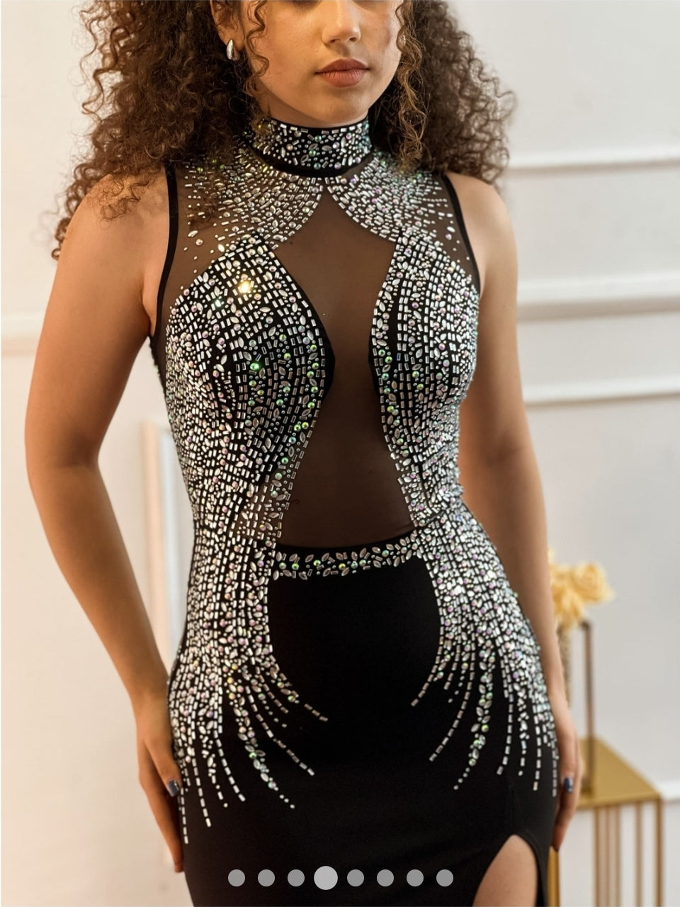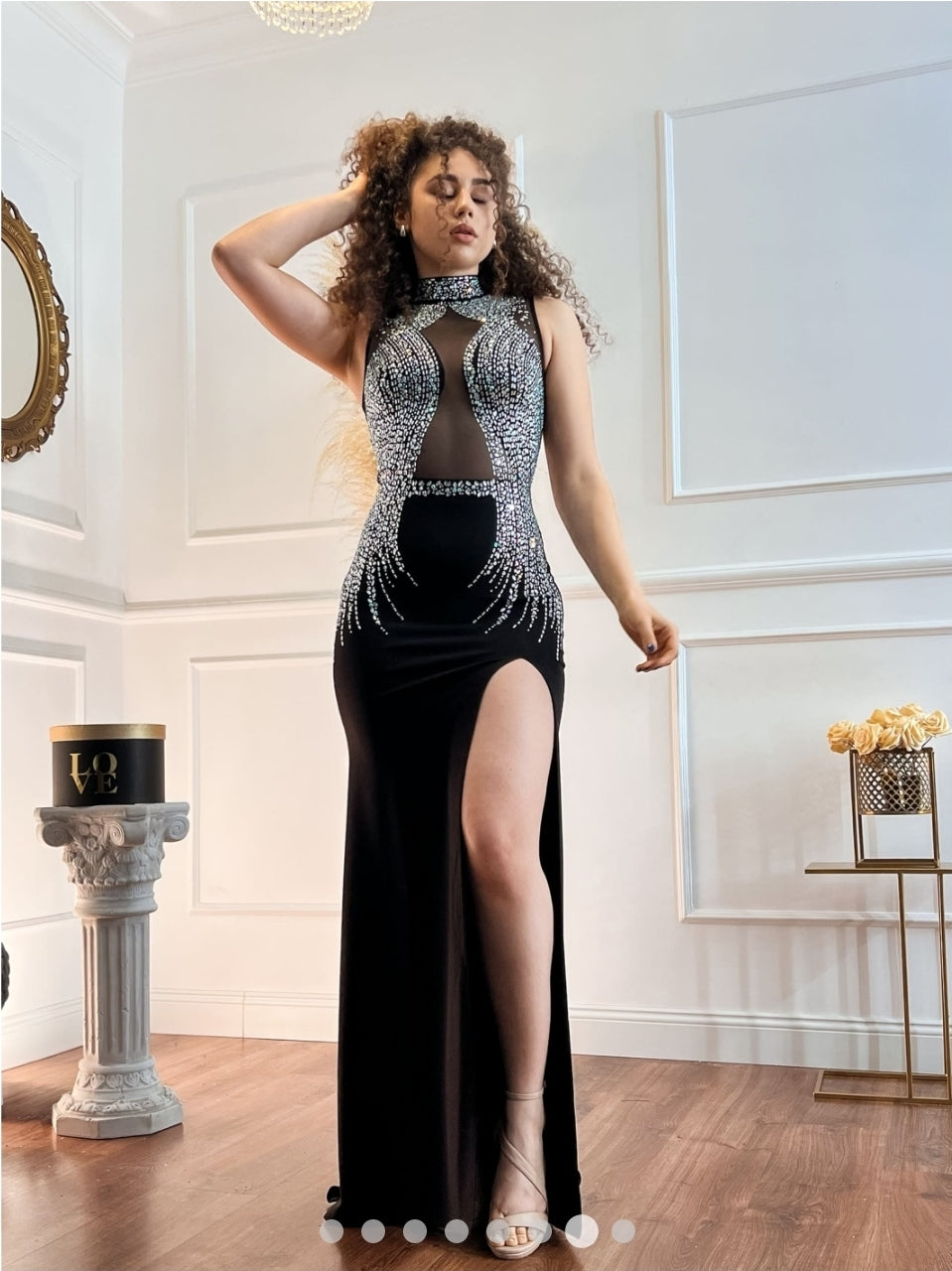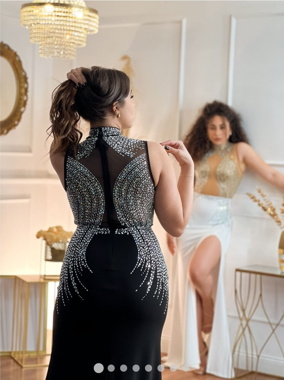 Modello: Abito lungo a sirena con corpetto in tessuto trasparente, che crea un effetto vedo-non vedo, svelando sottilmente la pelle con un tocco di mistero. Il dettaglio principale è il disegno di pietre preziose di varie forme e dimensioni, che decorano il corpetto iniziando dal mezzo collo e scendendo lungo il décolleté, per poi fluire lungo i fianchi, creando un effetto di ali. La gonna avvolge delicatamente le curve, ma allo stesso tempo è audace grazie allo spacco alto realizzato su una gamba