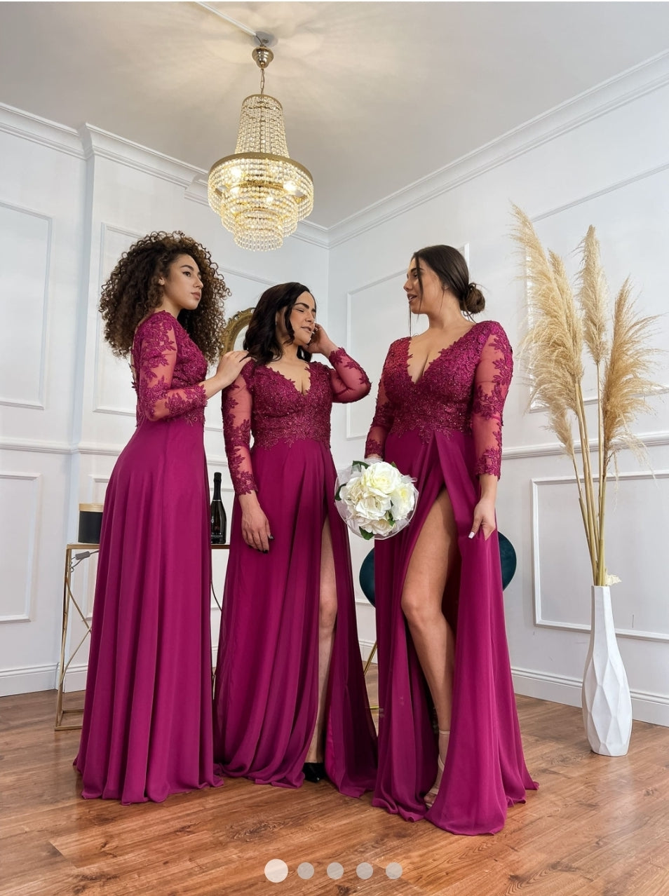 Modello: Abito lungo con corpetto in pizzo con coppe preformate e con doppia manica. Scollatura profonda sia sul davanti che sulla schiena a V e gonna in chiffon che parte dalla vita alta e presenta uno spacco laterale su una gamba molto profonda