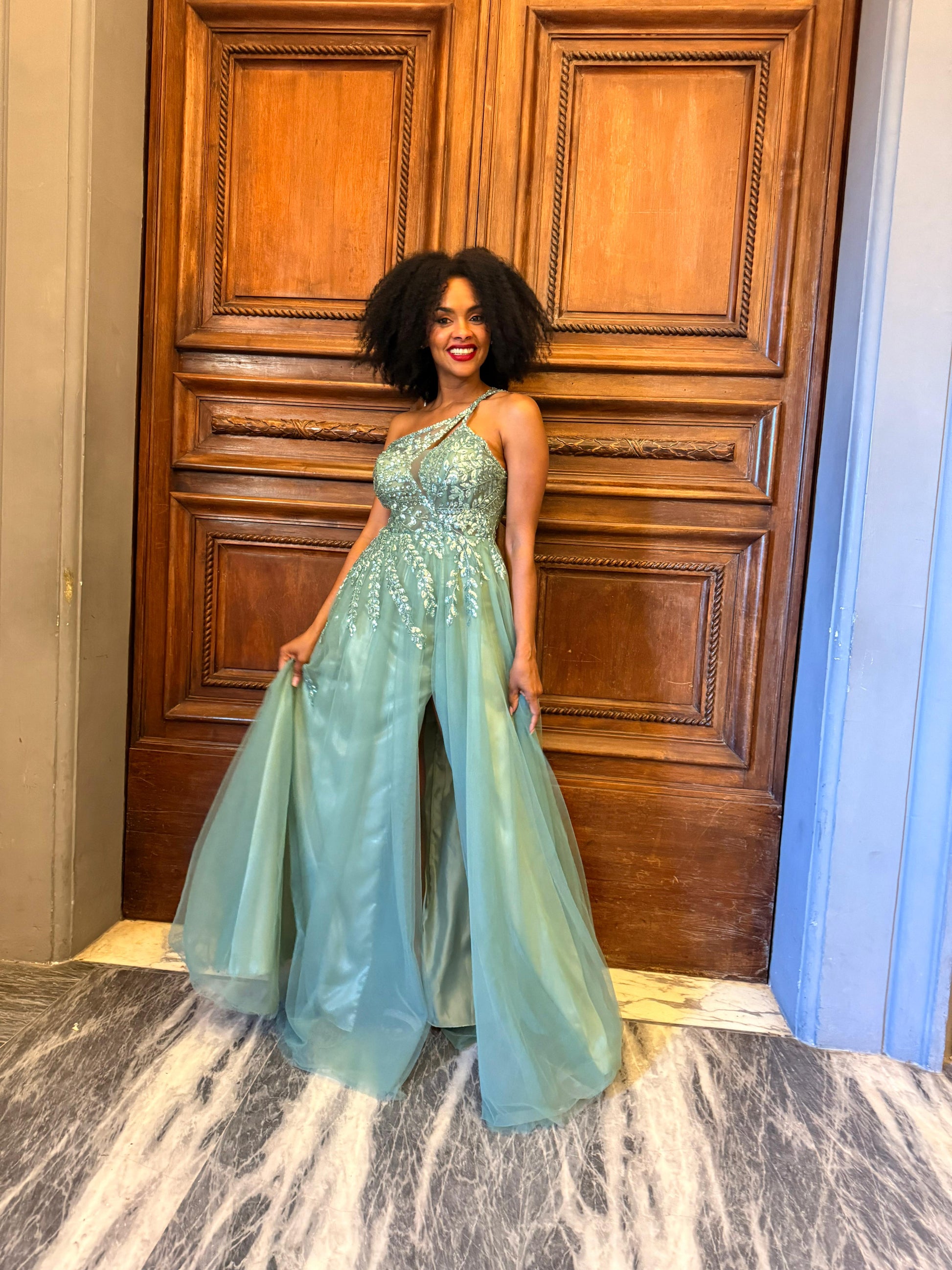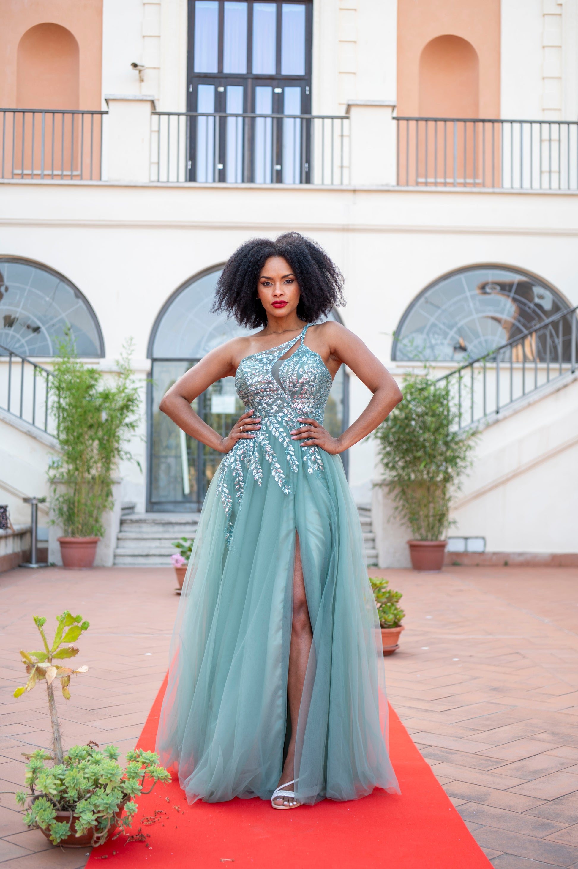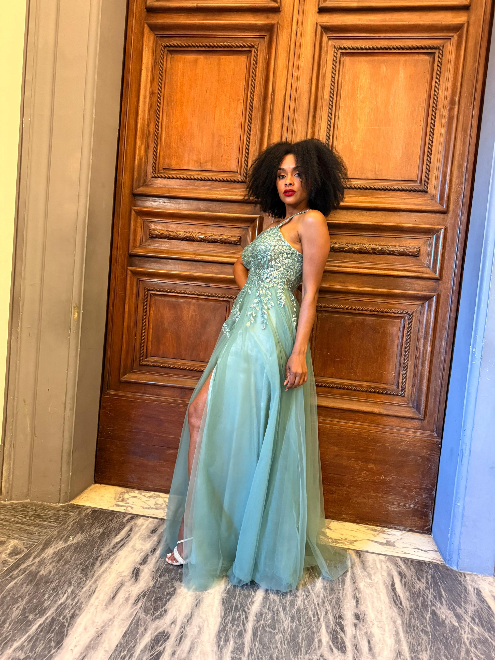 Modello: Abito che incanta con la sua allure eterea e seducente. Il corpetto asimmetrico, impreziosito da raffinati ricami floreali, scolpisce la silhouette con eleganza, mentre il gioco di trasparenze aggiunge un tocco di sensualità. La gonna in tulle vaporoso crea un movimento leggero e armonioso, esaltato da uno spacco discreto che dona modernità e carattere. Perfetto per chi desidera un look romantico ma irresistibilmente magnetico.