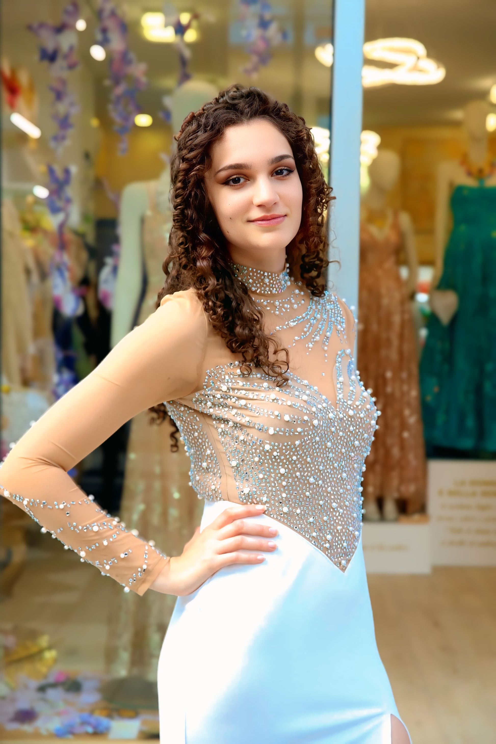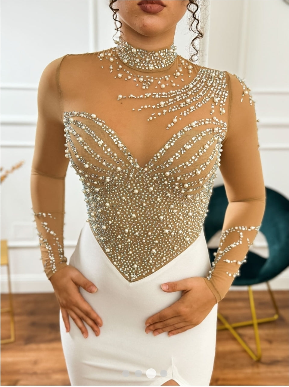 🥻Abito Sirena di straordinaria eleganza e sensualità che fonde dettagli preziosi con una linea moderna. Il corpetto, completamente ricoperto da un intricato gioco di strass e applicazioni scintillanti, si estende su una base nude che crea un effetto seconda pelle, valorizzando il décolleté con un delicato scollo a cuore. Le maniche trasparenti, arricchite da applicazioni luminose, aggiungono un tocco sofisticato e regale. La gonna in tessuto fluido, con un audace spacco laterale, dona movimento e femminilità, rendendolo perfetto per chi vuole distinguersi con classe in ogni occasione speciale.