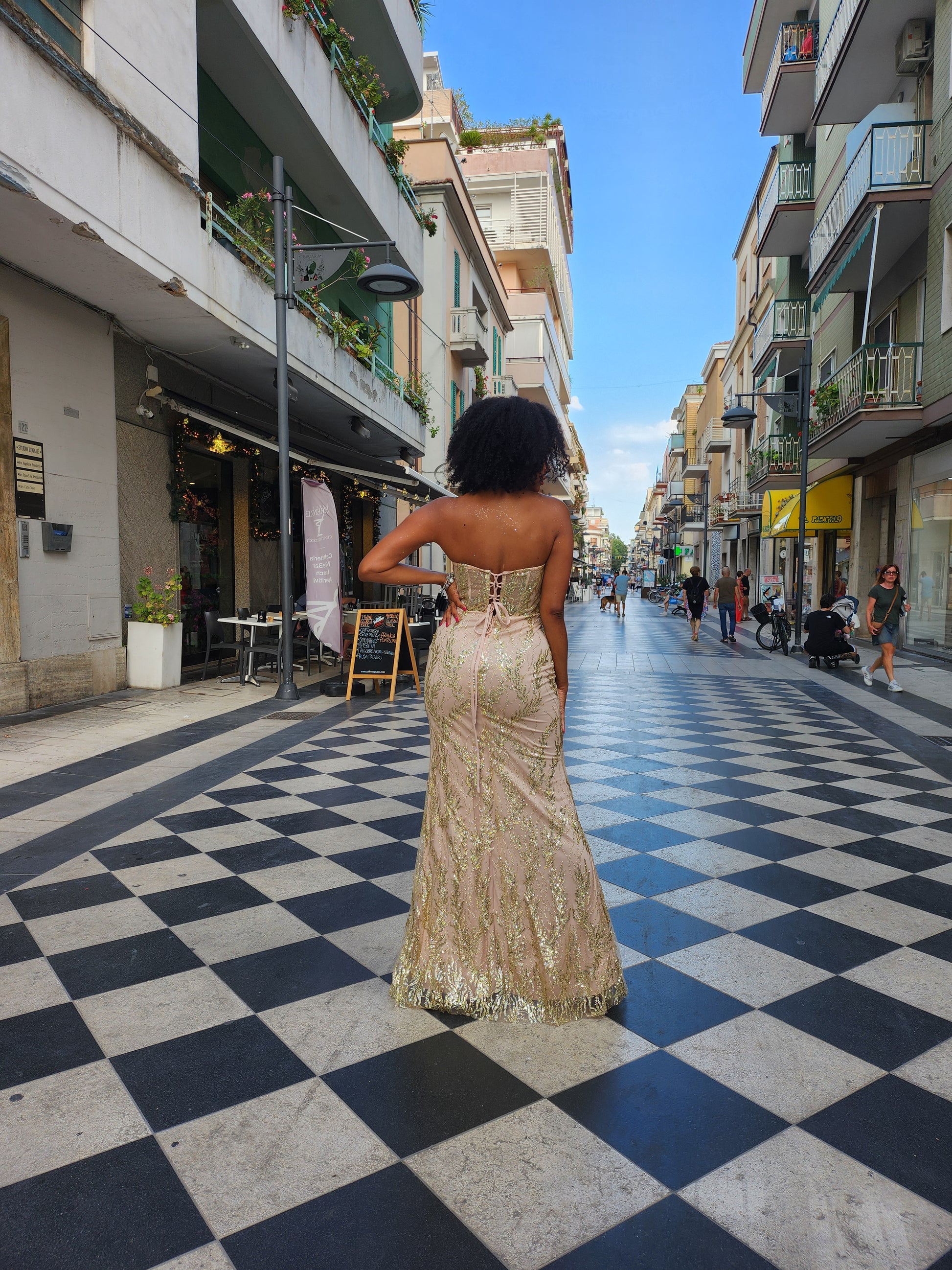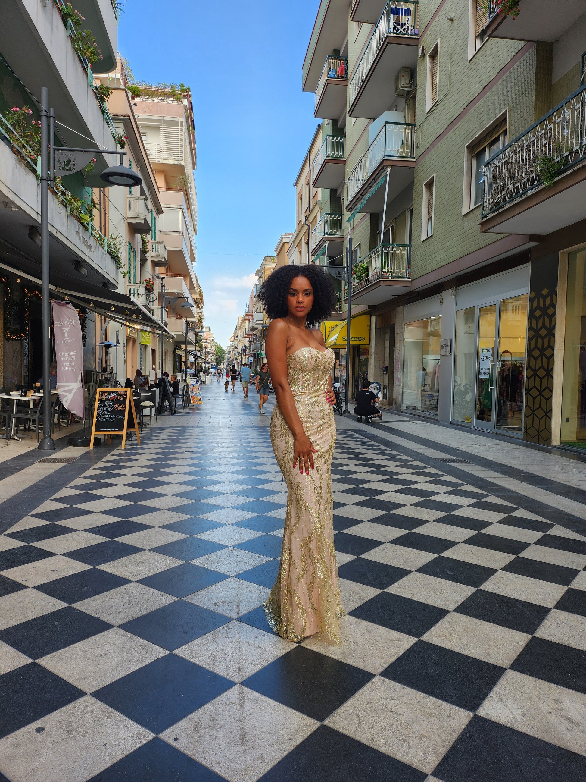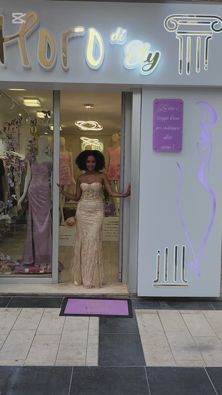 Modello: Abito lungo a sirena con corpetto modello bustier e gonnellone fasciante sulla figura dalla vita fin giù dove si apre in un ondulazione che ricorda il movimento fluttuante delle onde del mare. Il disegno realizzato con pailettes ricorda i fondali marini costeggiati da rami di corallo, che ne danno particolarità e ricchezza
