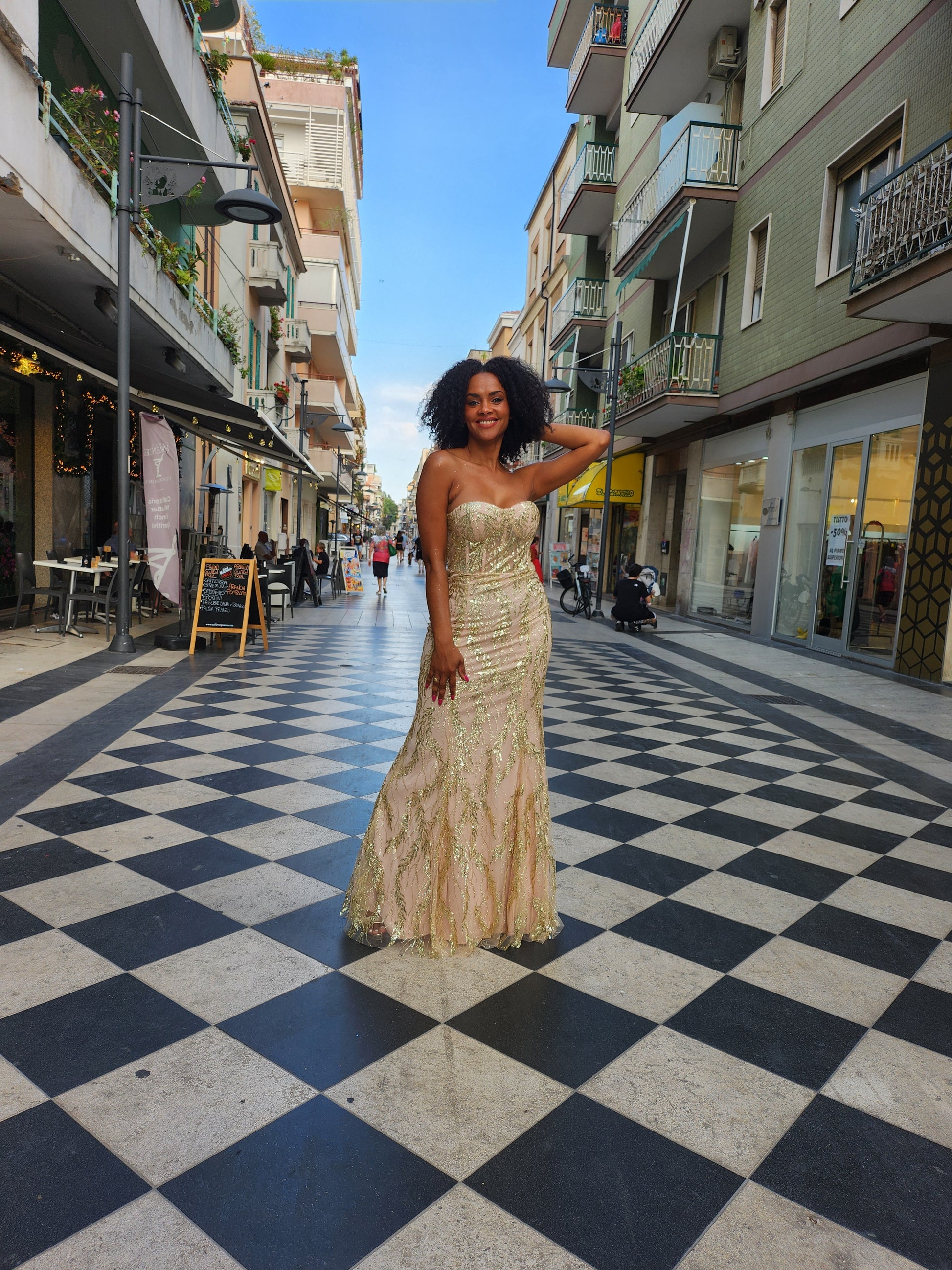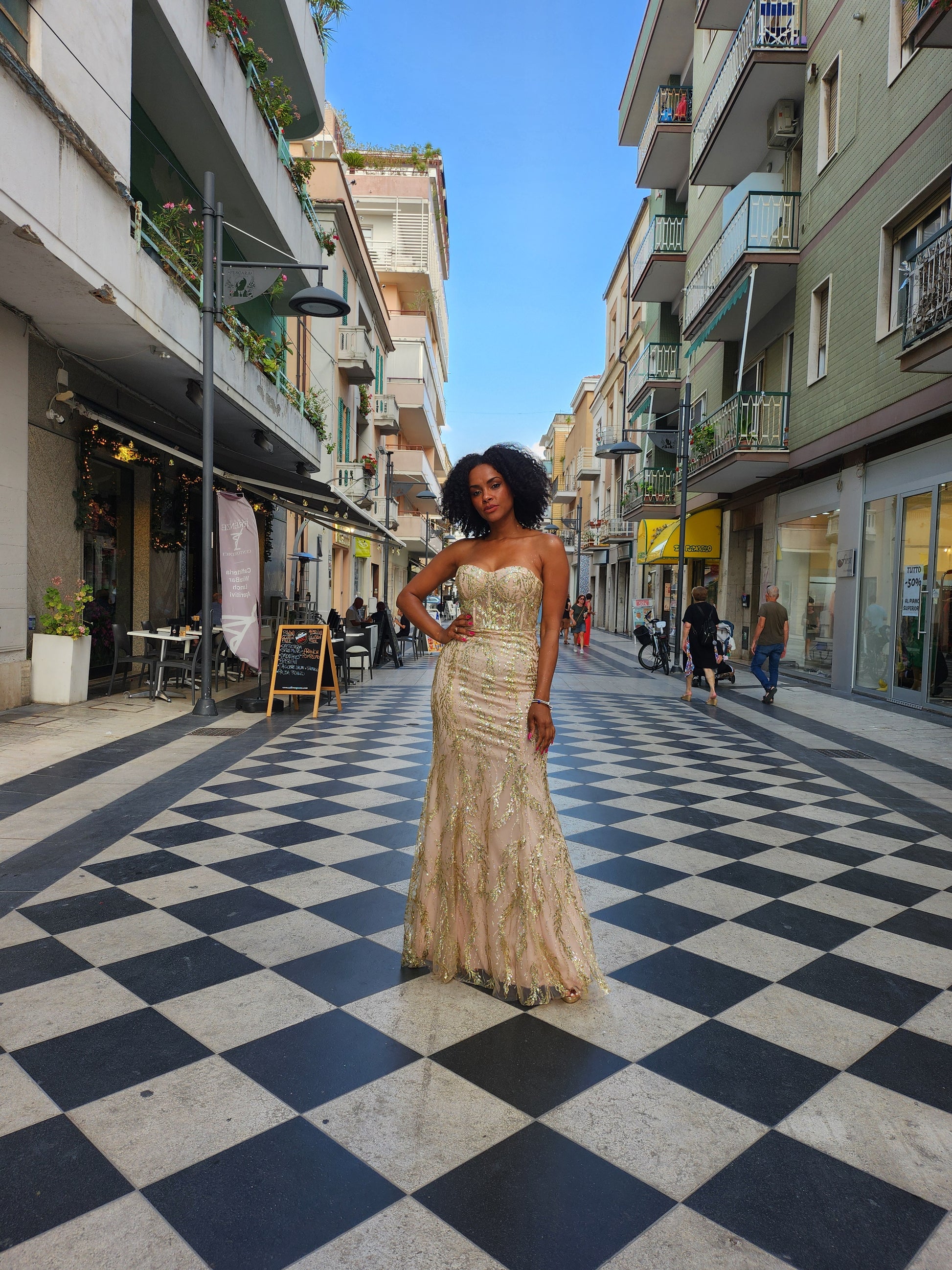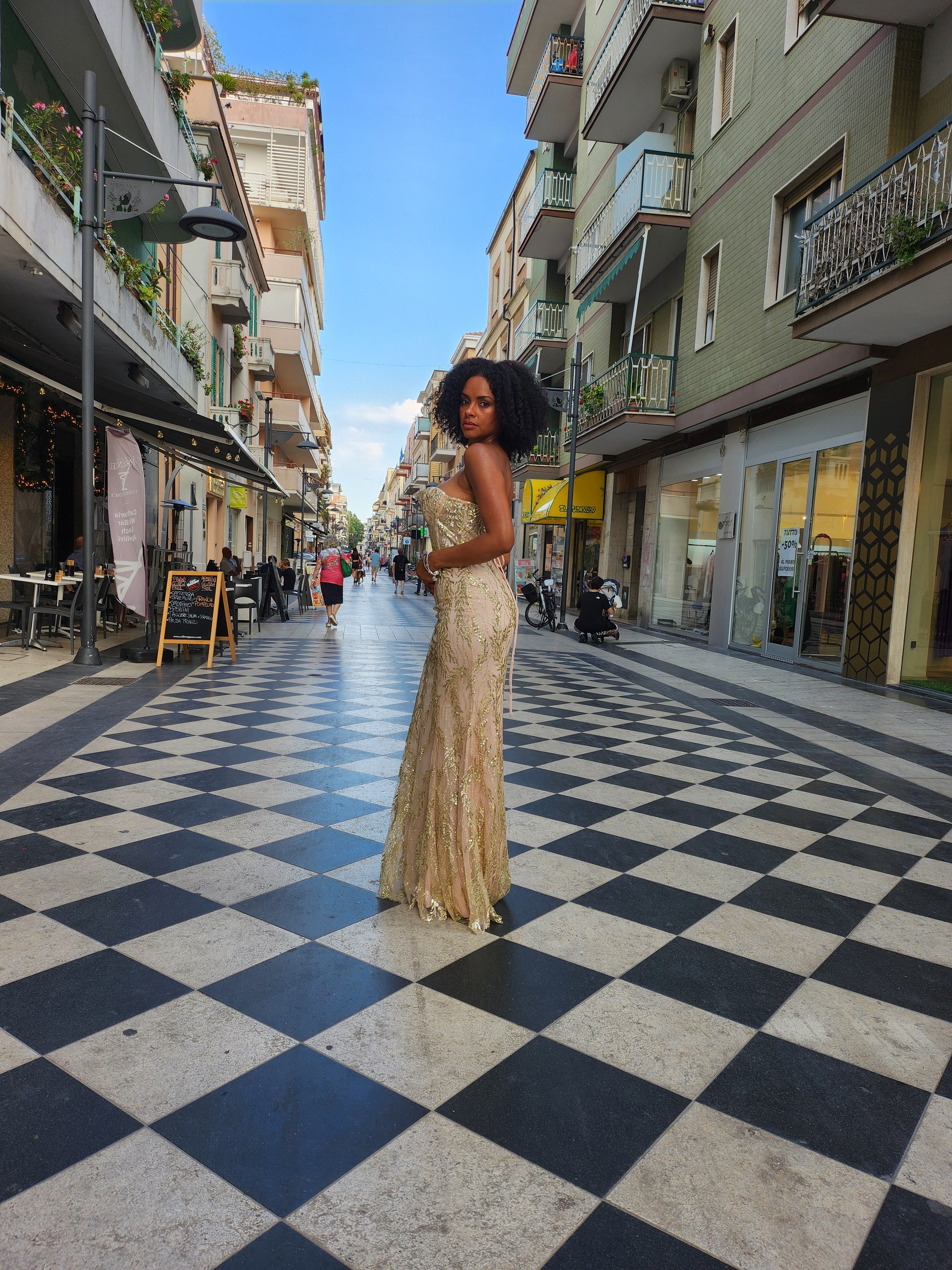 Modello: Abito lungo a sirena con corpetto modello bustier e gonnellone fasciante sulla figura dalla vita fin giù dove si apre in un ondulazione che ricorda il movimento fluttuante delle onde del mare. Il disegno realizzato con pailettes ricorda i fondali marini costeggiati da rami di corallo, che ne danno particolarità e ricchezza