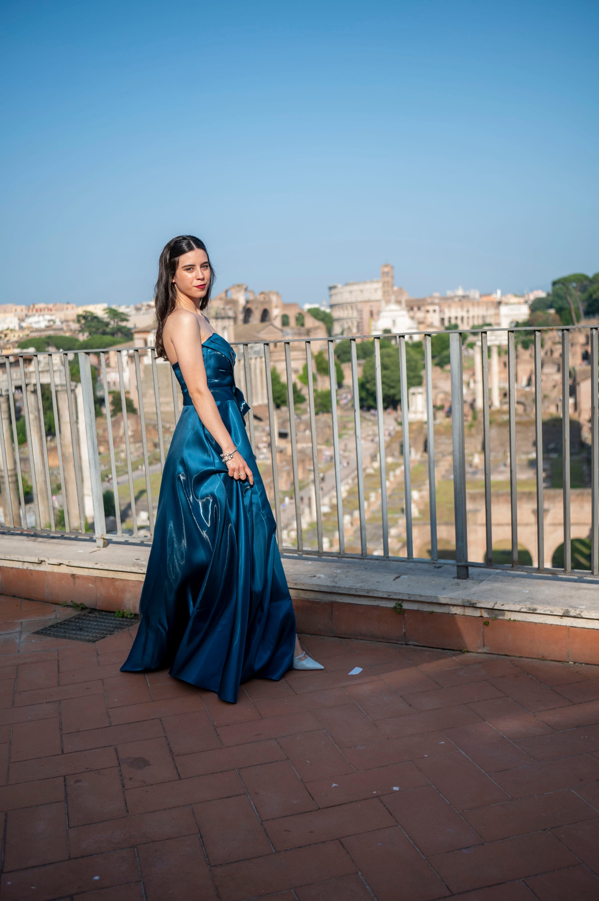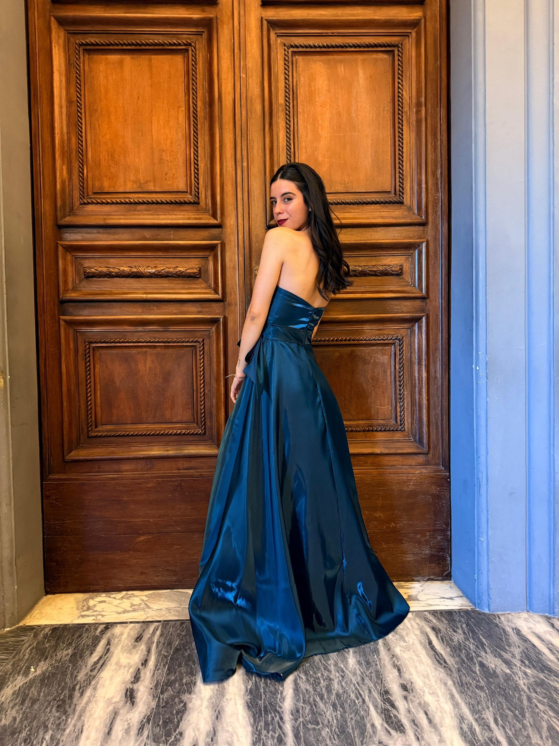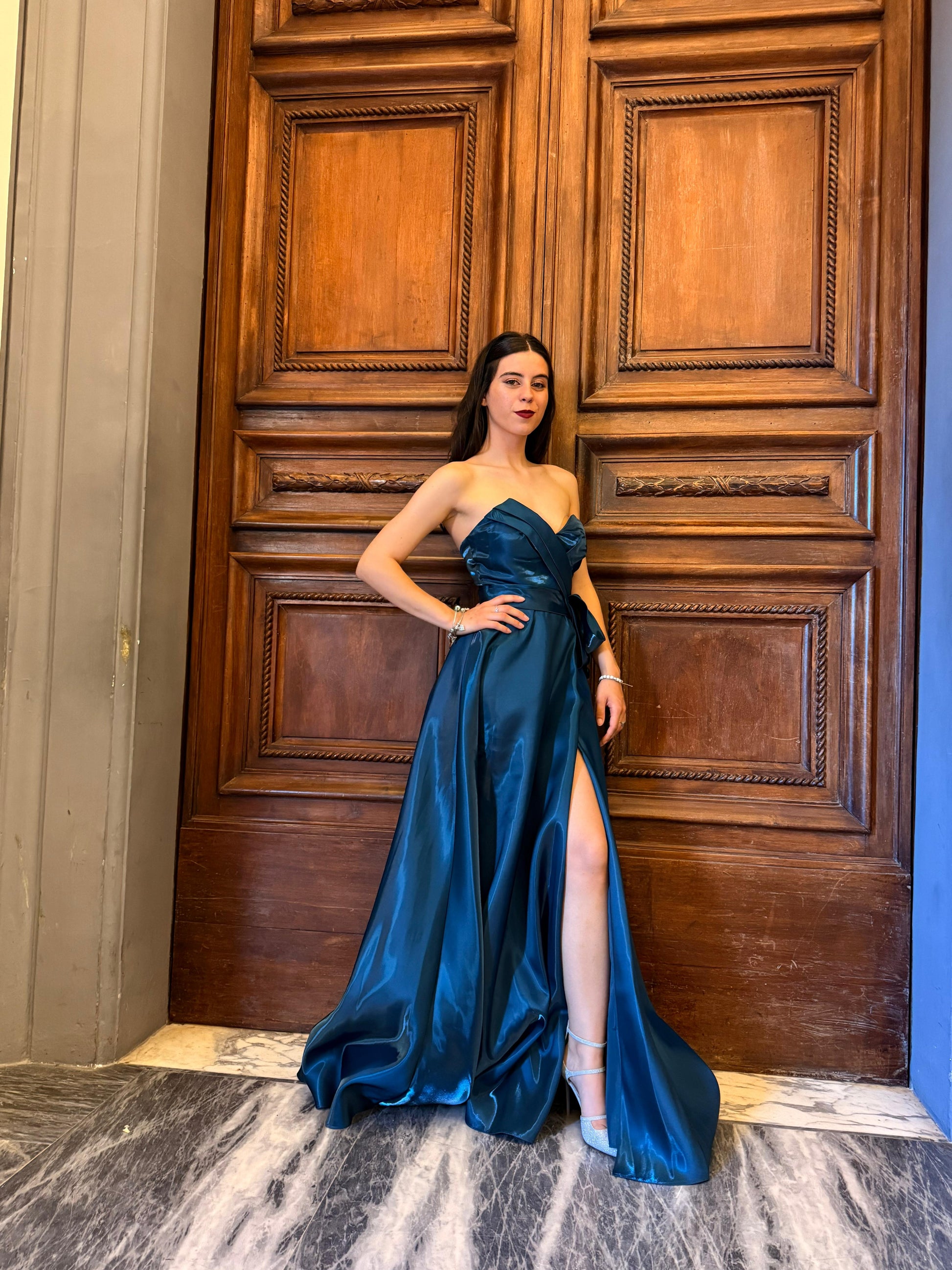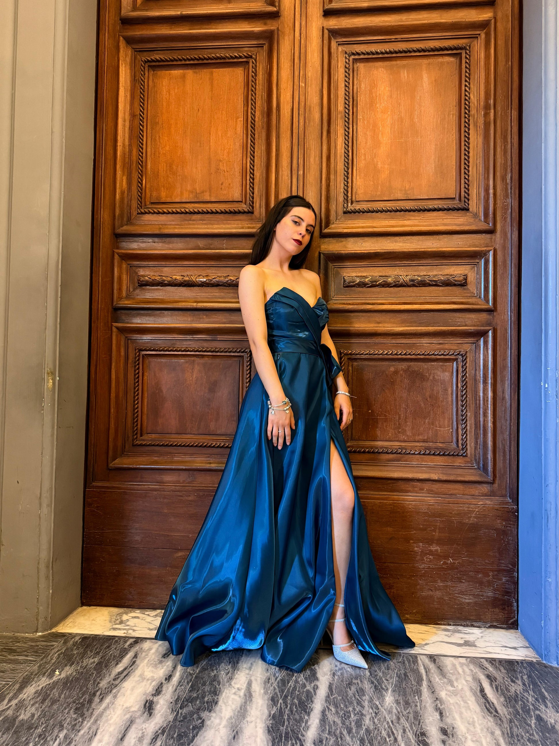 Modello: Abito dallo stile raffinato e deciso, caratterizzato da un corpetto strutturato con scollo a cuore che valorizza il décolleté con eleganza. La cintura annodata in vita sottolinea la silhouette, aggiungendo un tocco di femminilità. La gonna ampia e fluida, realizzata in un tessuto luminoso, è impreziosita da un audace spacco frontale che dona movimento e sensualità. Perfetto per chi desidera un look sofisticato e d'impatto.