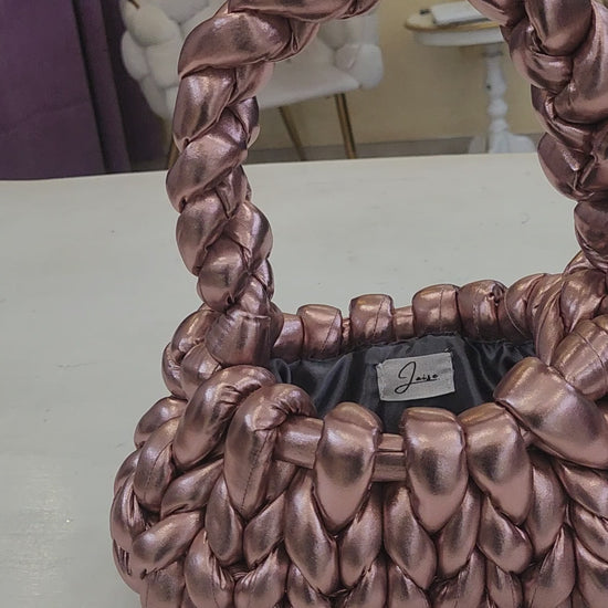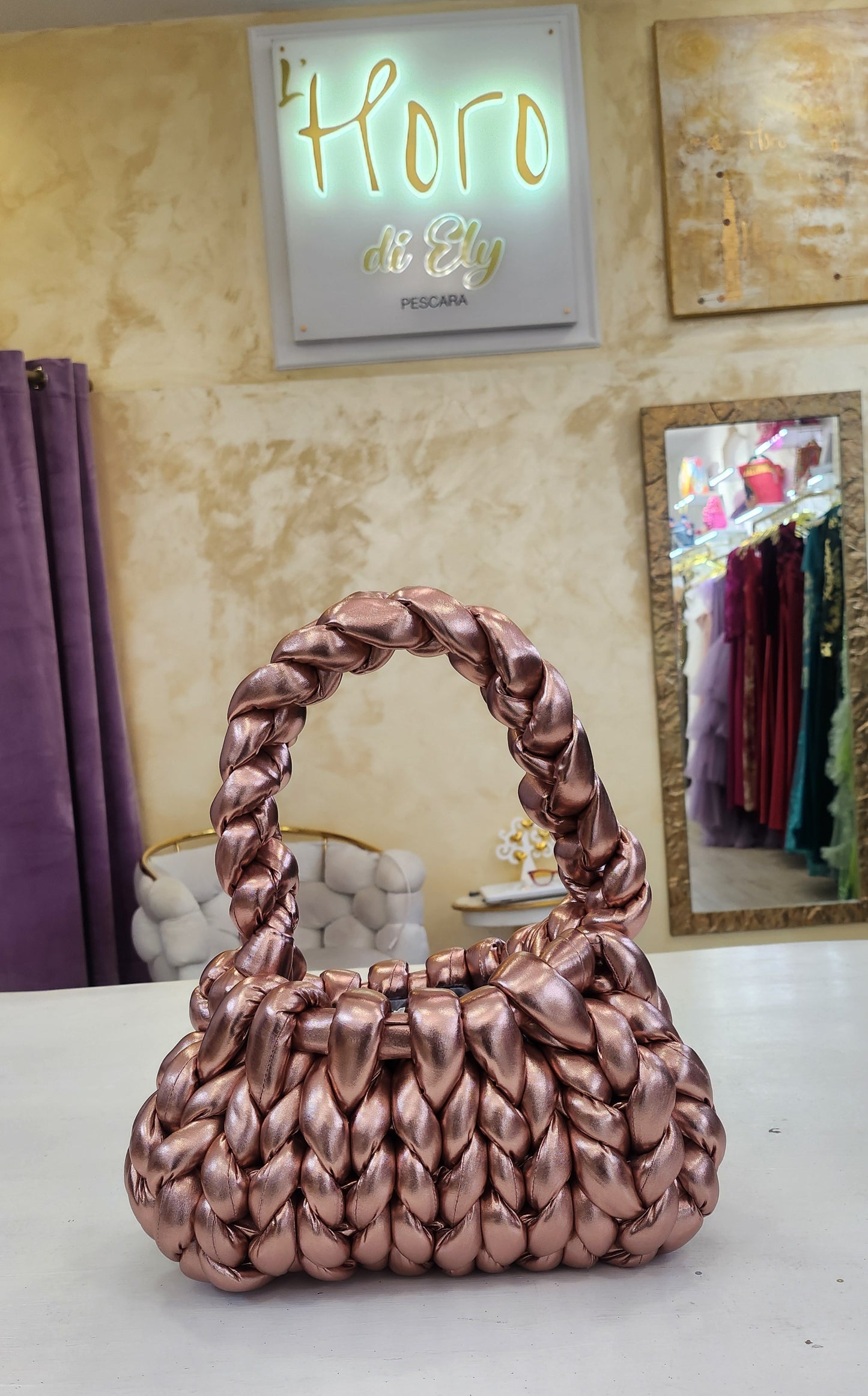 La Chuncky Bag Bronze Elegance JAISEBAG è una borsa artigianale di lusso, realizzata interamente a mano all’uncinetto con un pregiato filato effetto satinato color bronzo rosato. Questo materiale brillante e resistente crea un intreccio tridimensionale unico, che riflette la luce e dona alla borsa un’eleganza sofisticata e contemporanea.