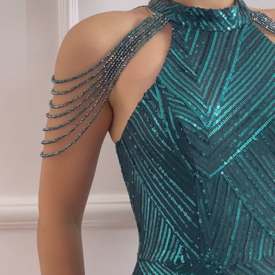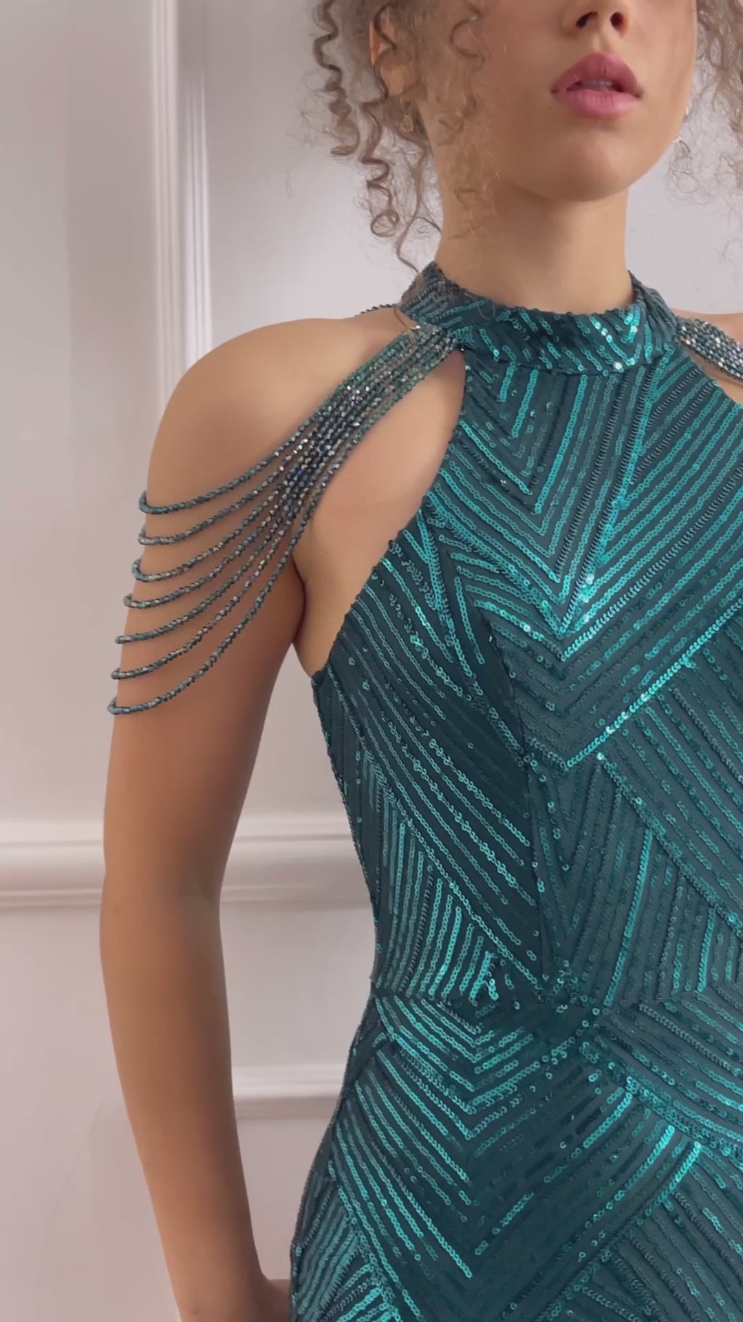 Modello: Abito da cerimonia a sirena con una costruzione che valorizza la figura in modo deciso e armonioso. La linea aderisce lungo busto, vita e fianchi, poi si apre in una svasatura controllata che accompagna il passo senza appesantire. Il corpino presenta un collo alto che slancia il portamento e un’apertura sulla spalla che lascia scoperti i lati superiori delle braccia. Da qui partono catene di micro-gioielli che scendono in più livelli, creando un gioco di curve luminose che incornicia il décolleté senza scoprirlo eccessivamente. L’intero abito è ricamato con motivi geometrici che si intersecano e guidano l’occhio lungo le linee della silhouette. Il risultato è un effetto scolpito e moderno, con una brillantezza elegante che rimane sempre ben dosata. È un modello pensato per serate formali, eventi di grande presenza scenica e cerimonie in cui si punta a un’eleganza iconica.