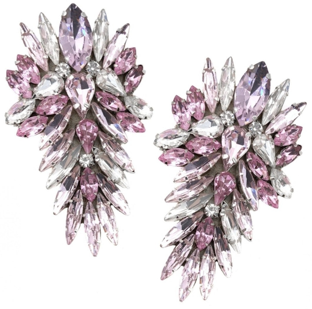 Orecchini rosa e argento realizzati a mano con cristalli, pietre acriliche montati su base di vera pelle.