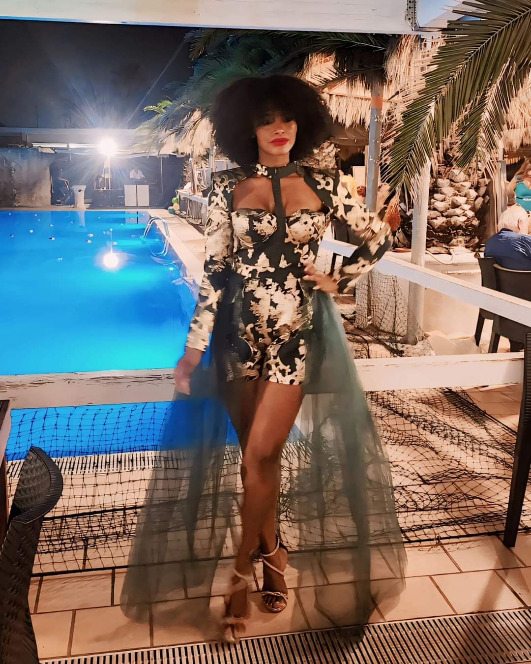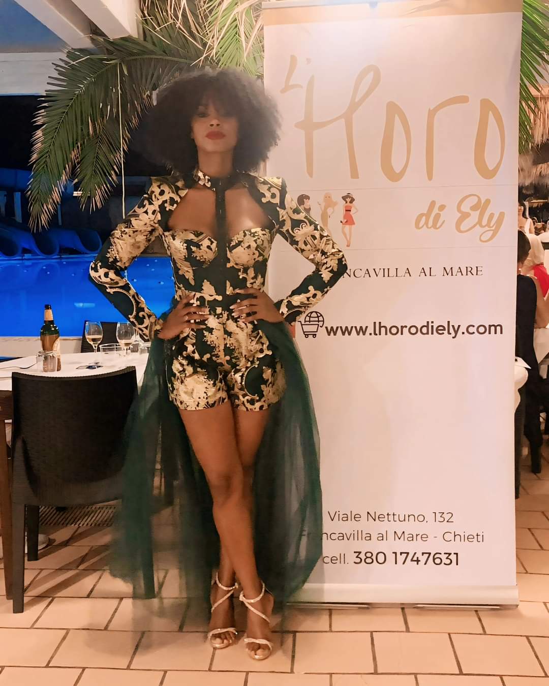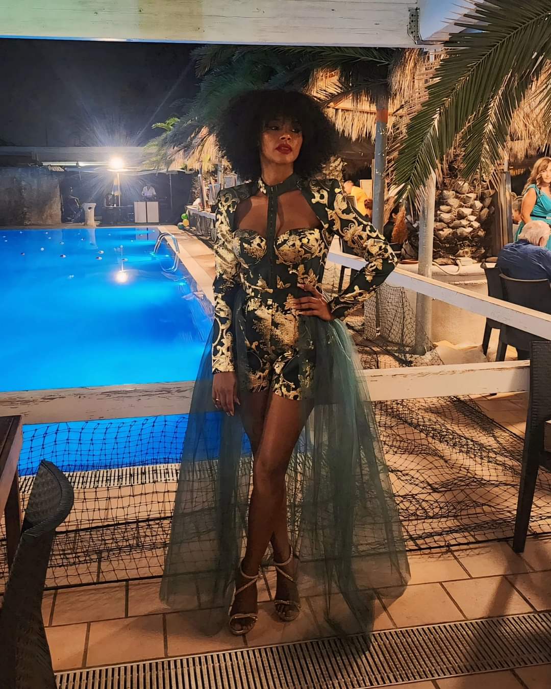Tuta con shorts corti e maniche lunghe damascate in oro, scollo a cuore e mantello di tulle in vita