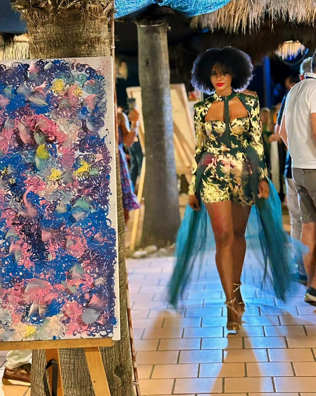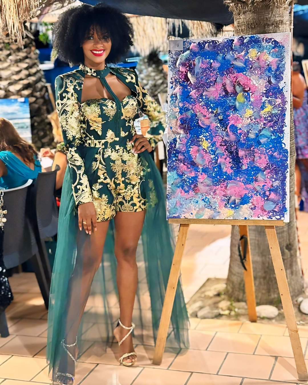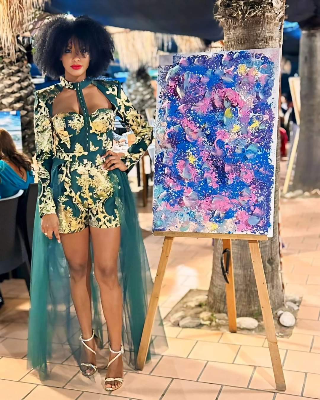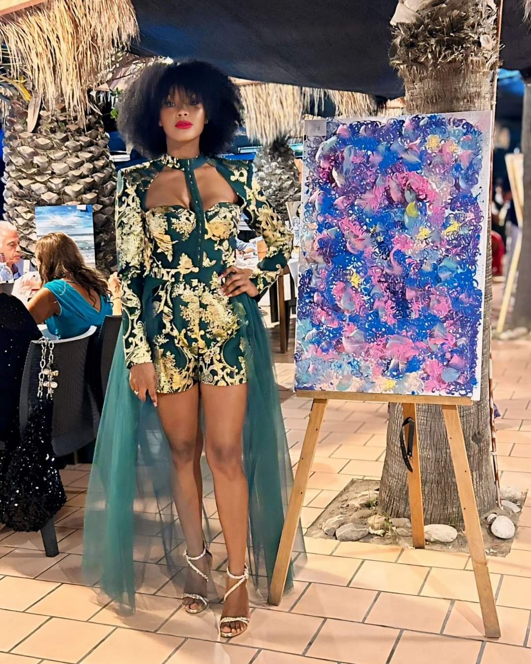 Tuta con shorts corti e maniche lunghe damascate in oro, scollo a cuore e mantello di tulle in vita