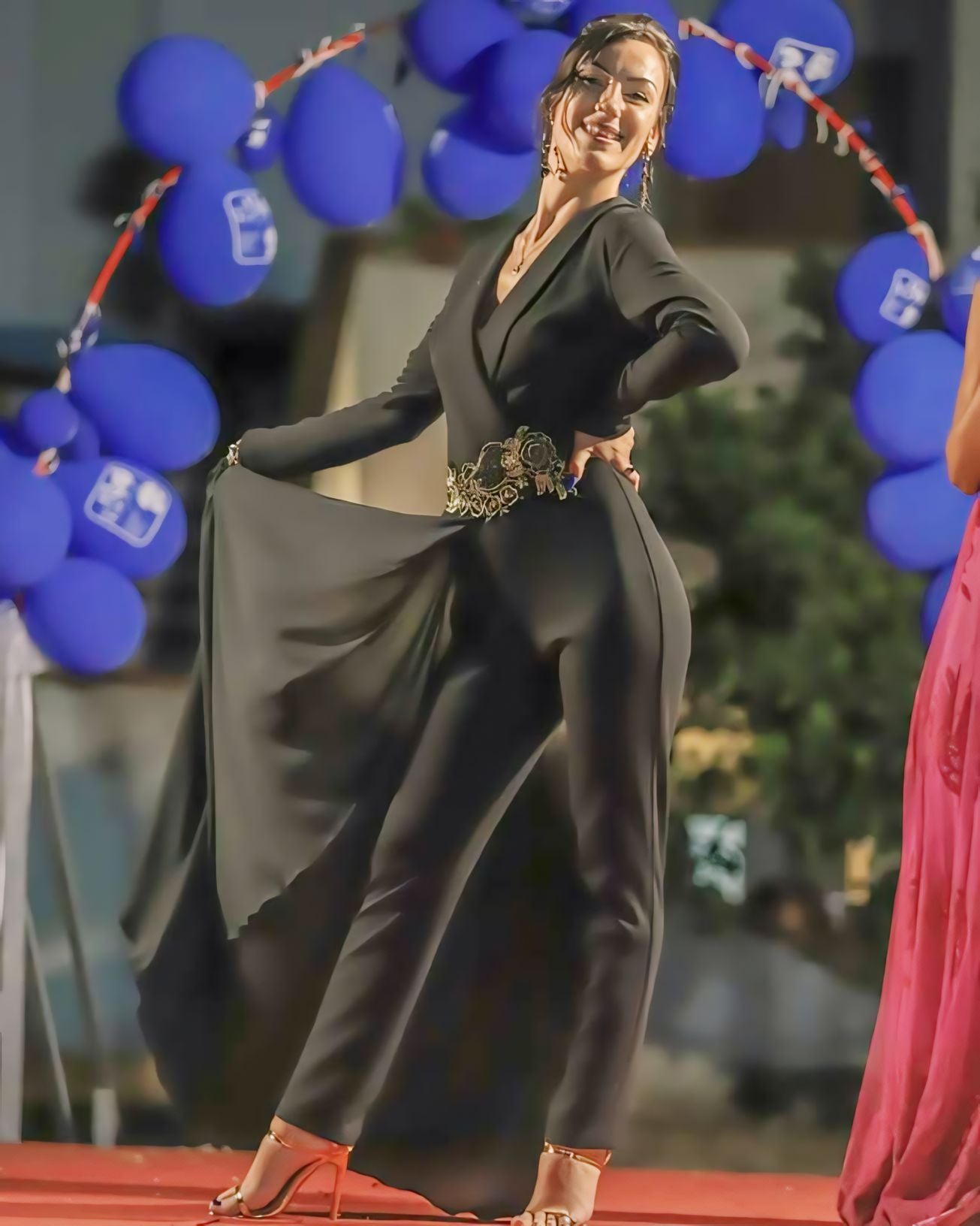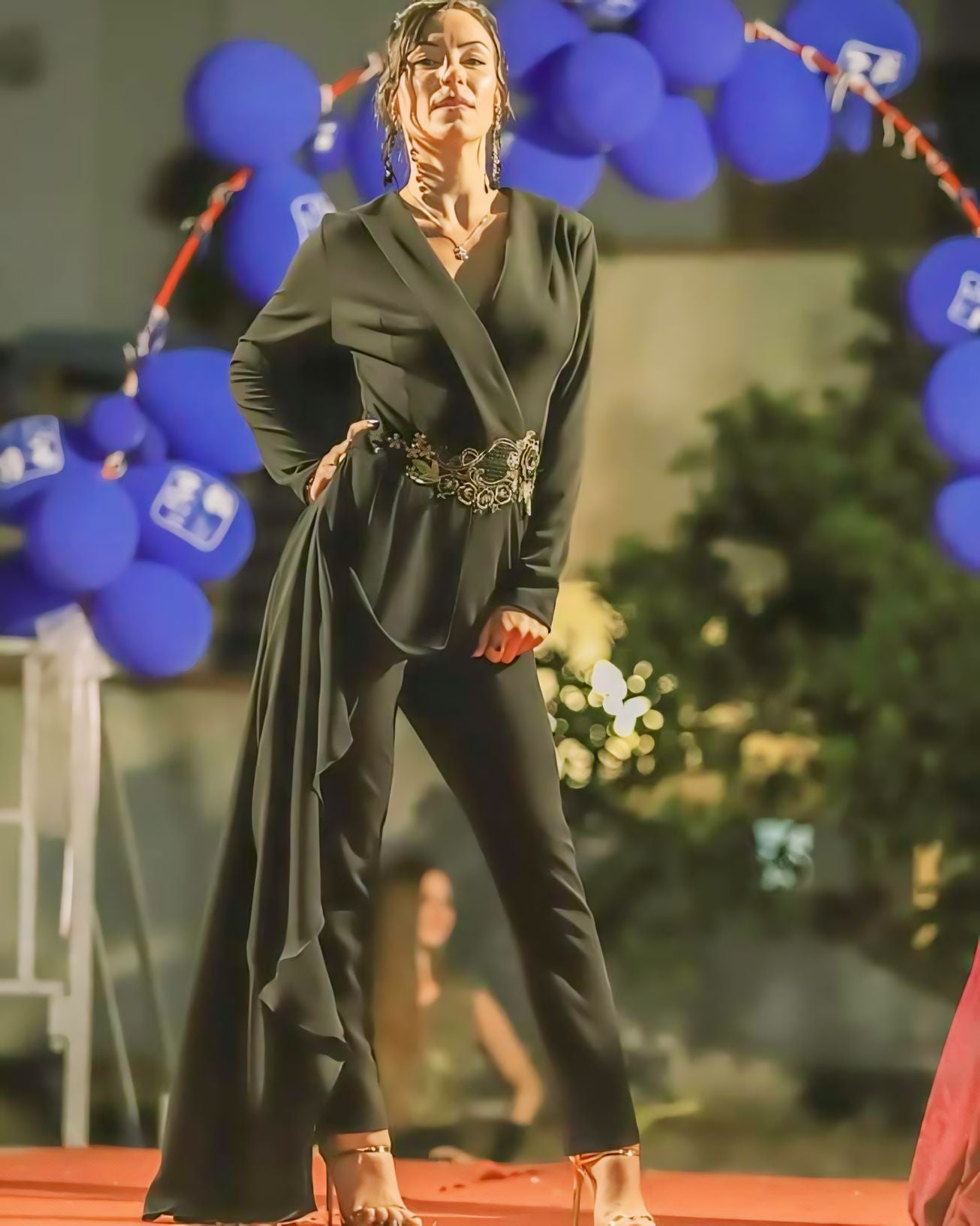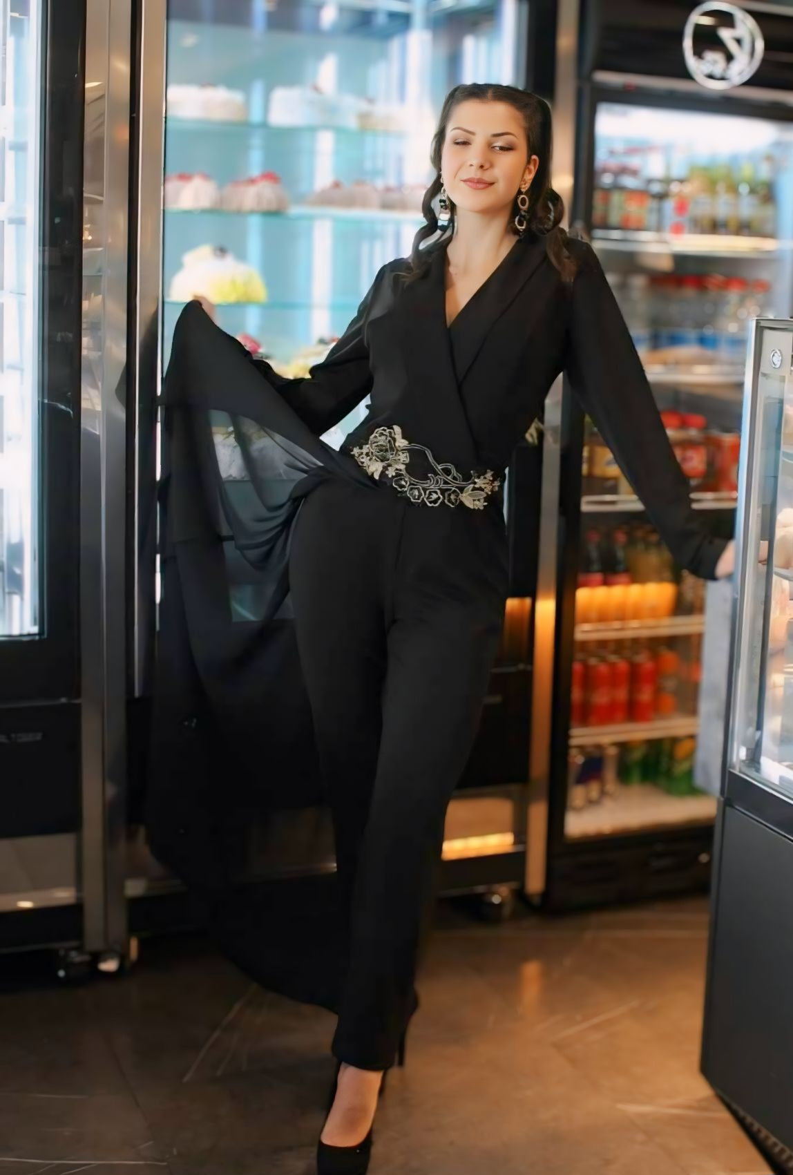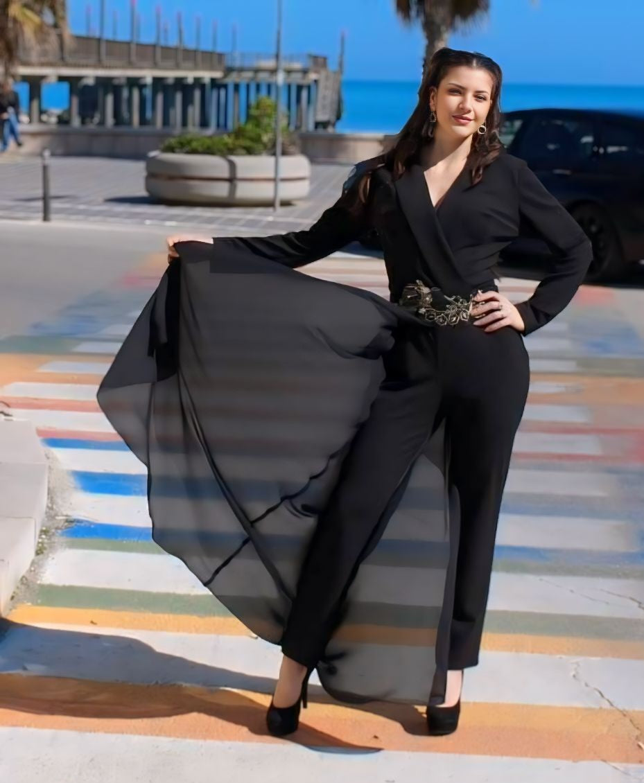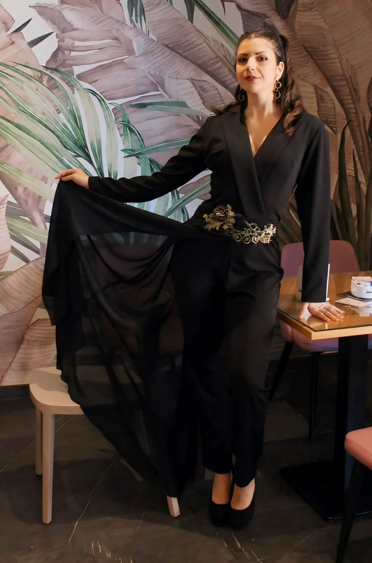 Tuta nera con mantello, pantaloni a sigaretta, scollo a V e ricamo intarsiato in vita color oro แถ โฑสณแตแตแตแต ๐๐ฝ๐ถ๐ธ๐ผ๐ฏ๐ฎ๐ป๐ฎ