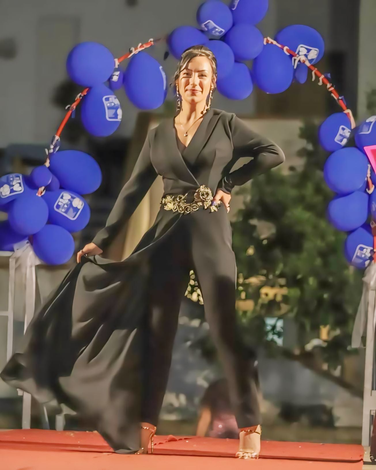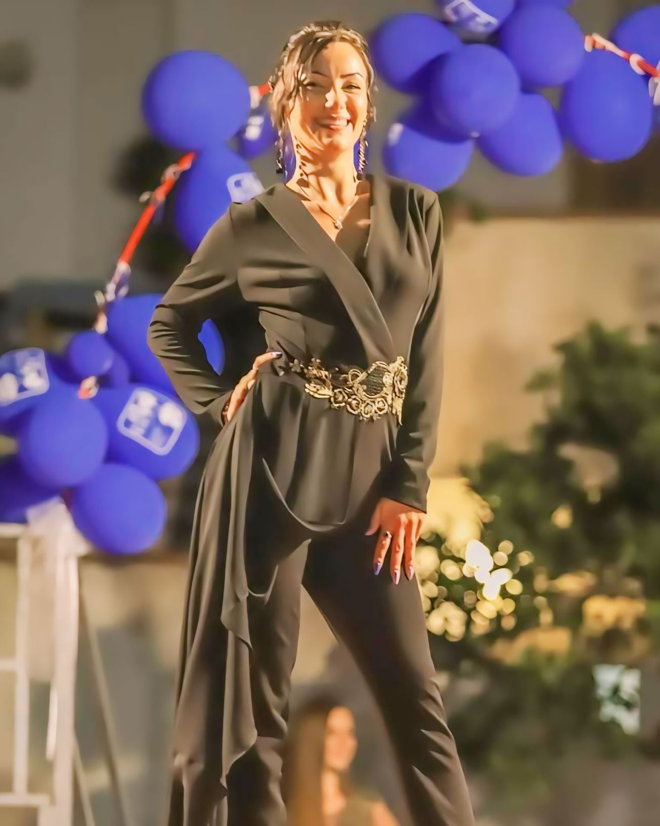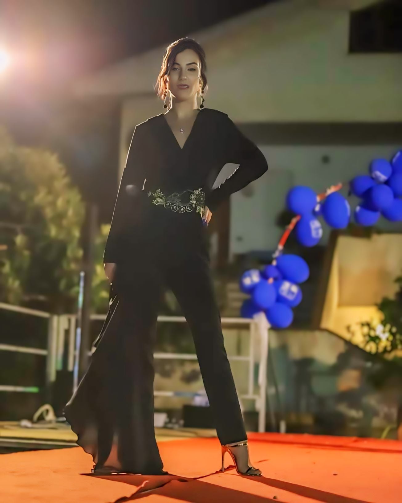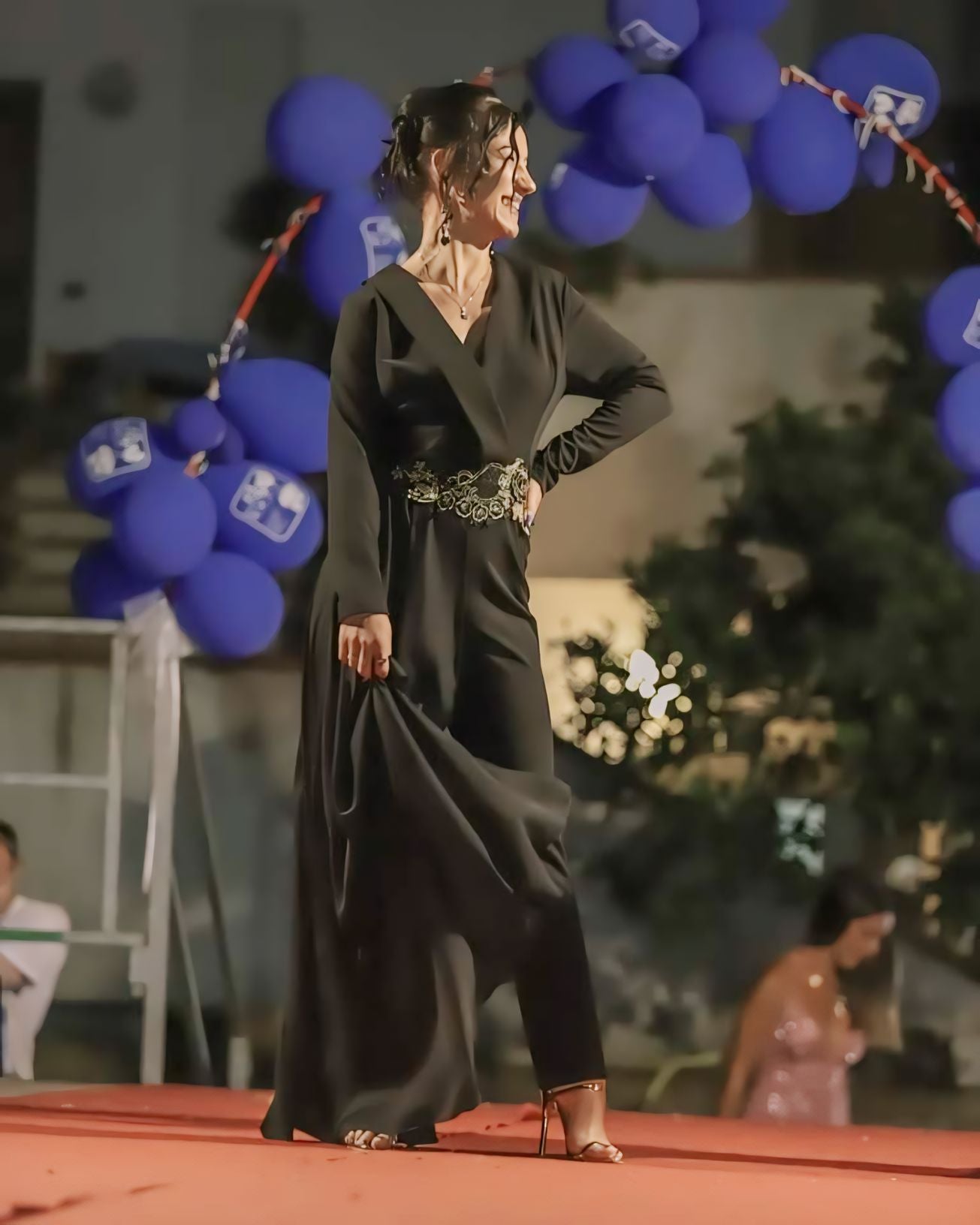 Tuta nera con mantello, pantaloni a sigaretta, scollo a V e ricamo intarsiato in vita color oro แถ โฑสณแตแตแตแต ๐๐ฝ๐ถ๐ธ๐ผ๐ฏ๐ฎ๐ป๐ฎ