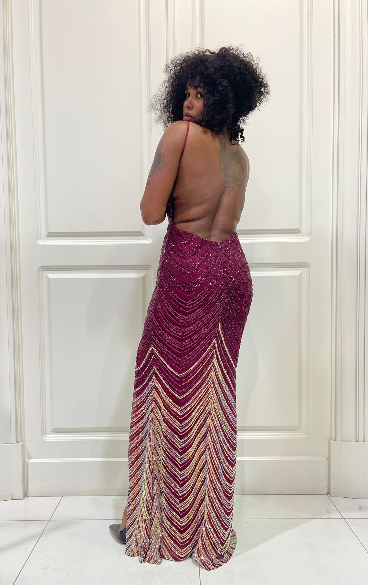 🥻Abito fantasie geometriche in paillettes bordeaux e oro. Scollo a V con spalline sottili, spacco laterale, schiena total nude.