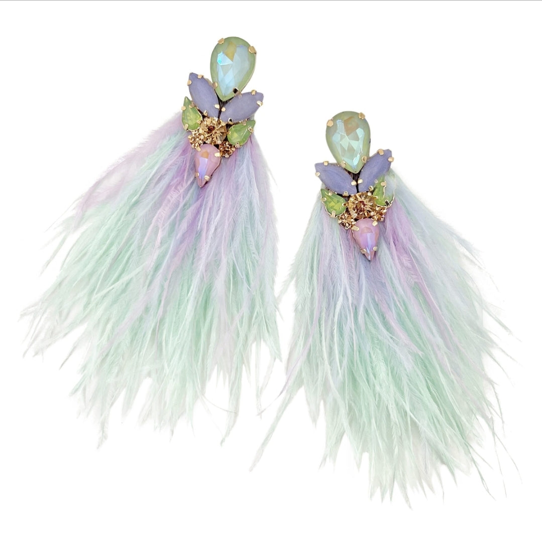 Orecchini anallergici realizzati a mano con cristalli montati su base in vera pelle e piume colorate verde acqua e glicine.