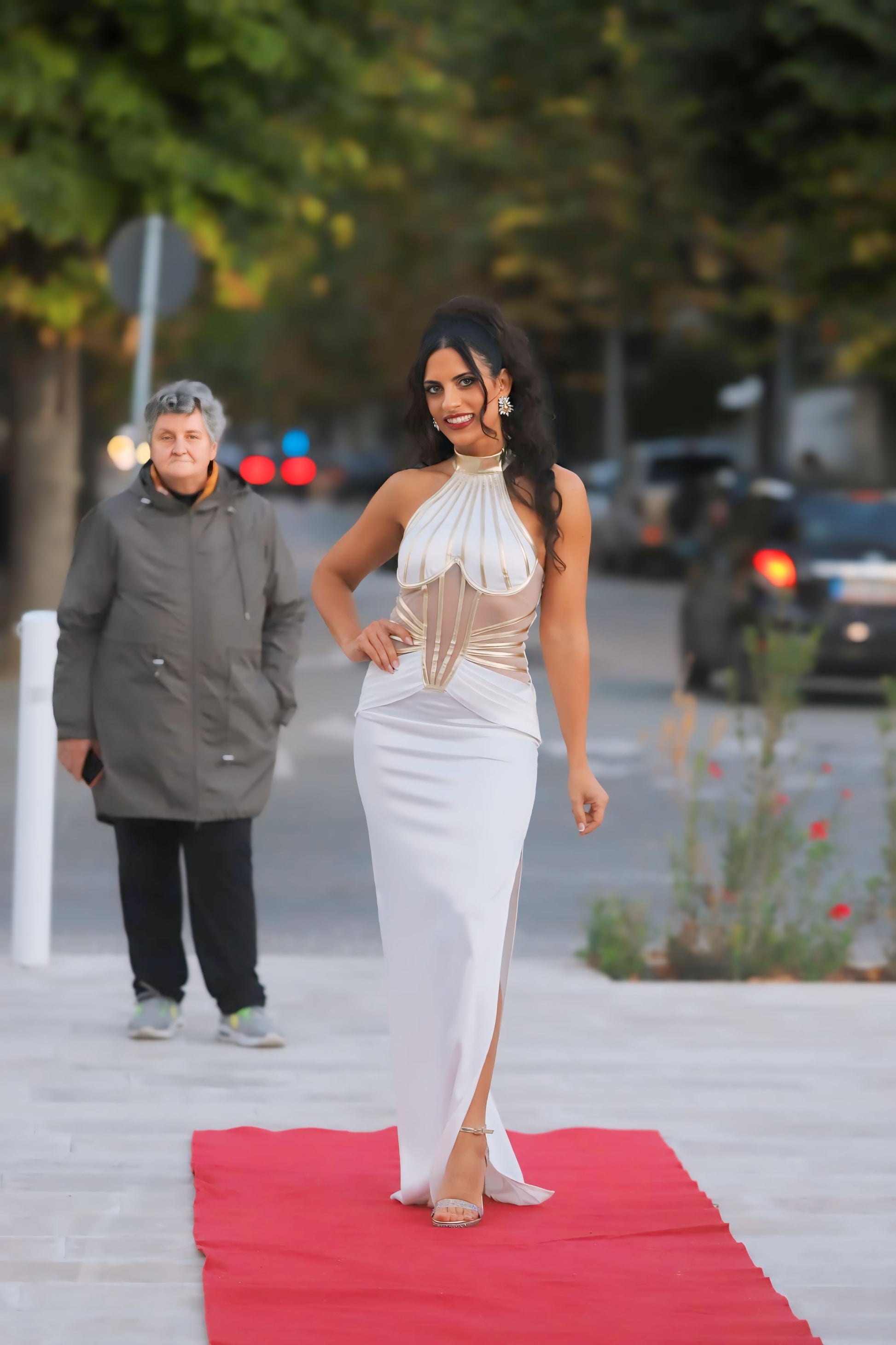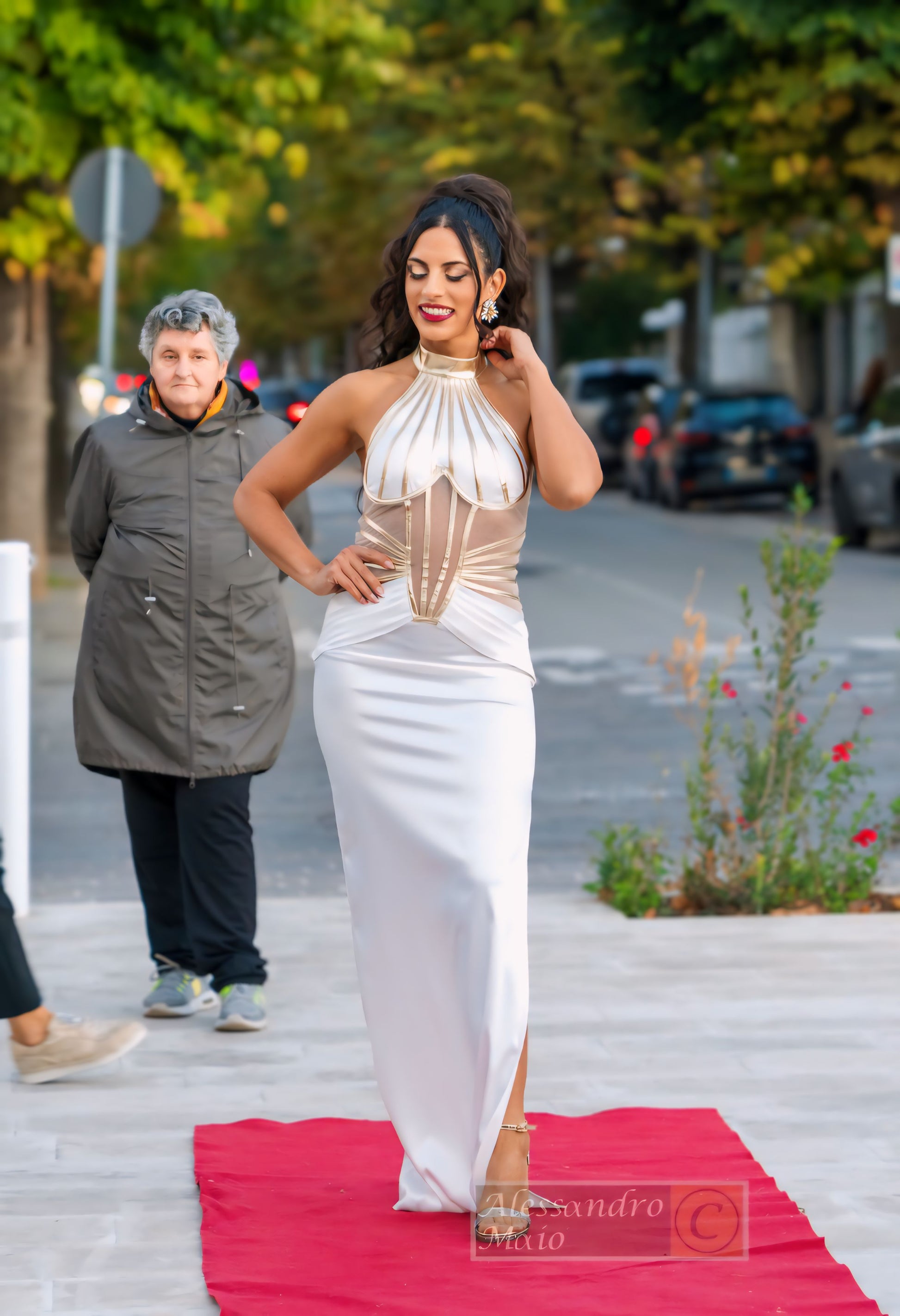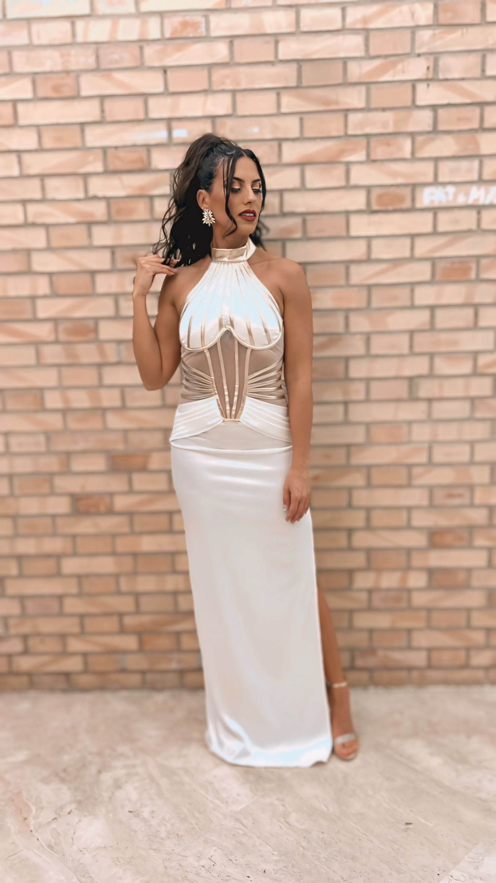 🥻Abito sirena bianco/oro in raso, con scollo all'americana guarnito con striscioline di pelle color oro. Spacco laterale.