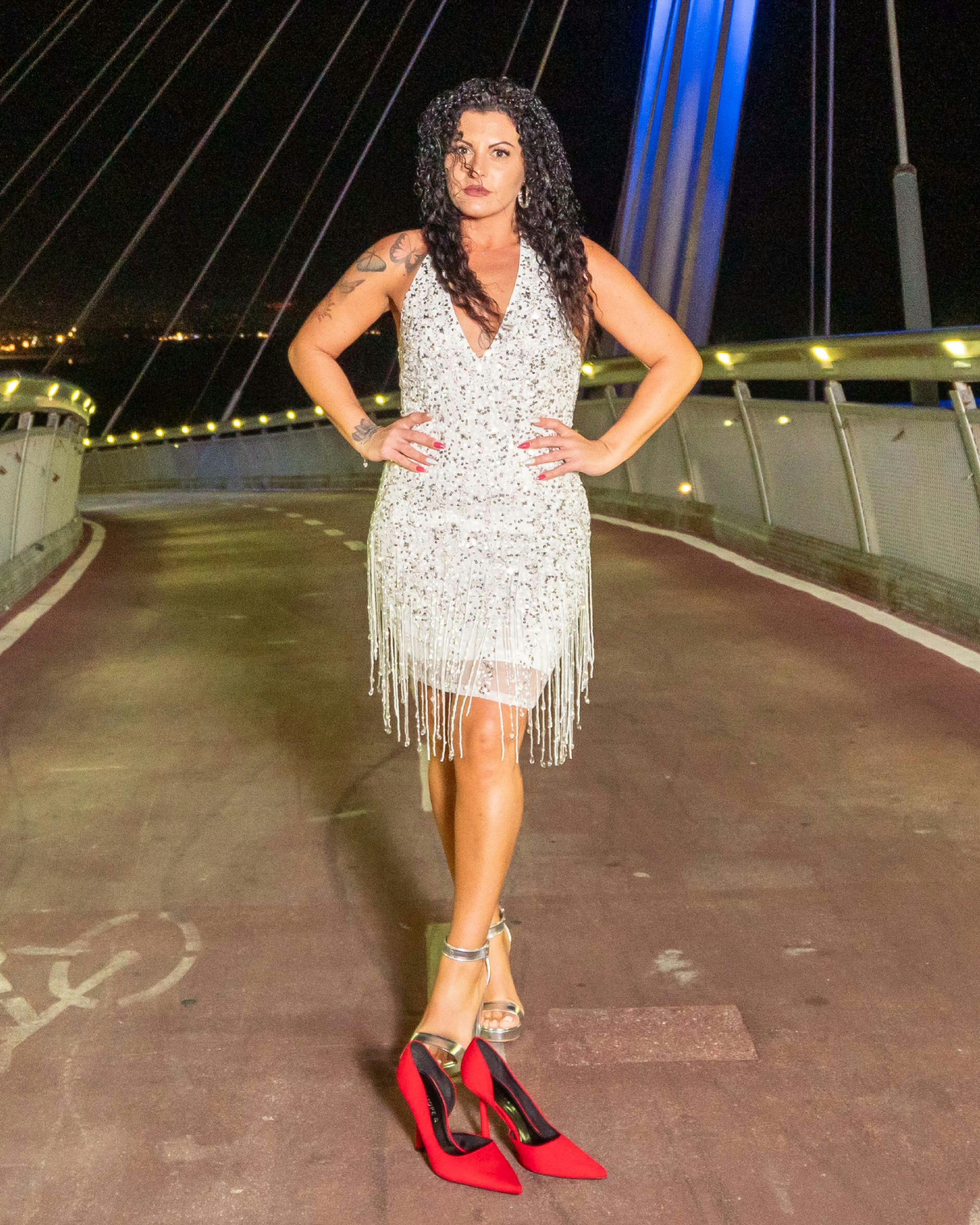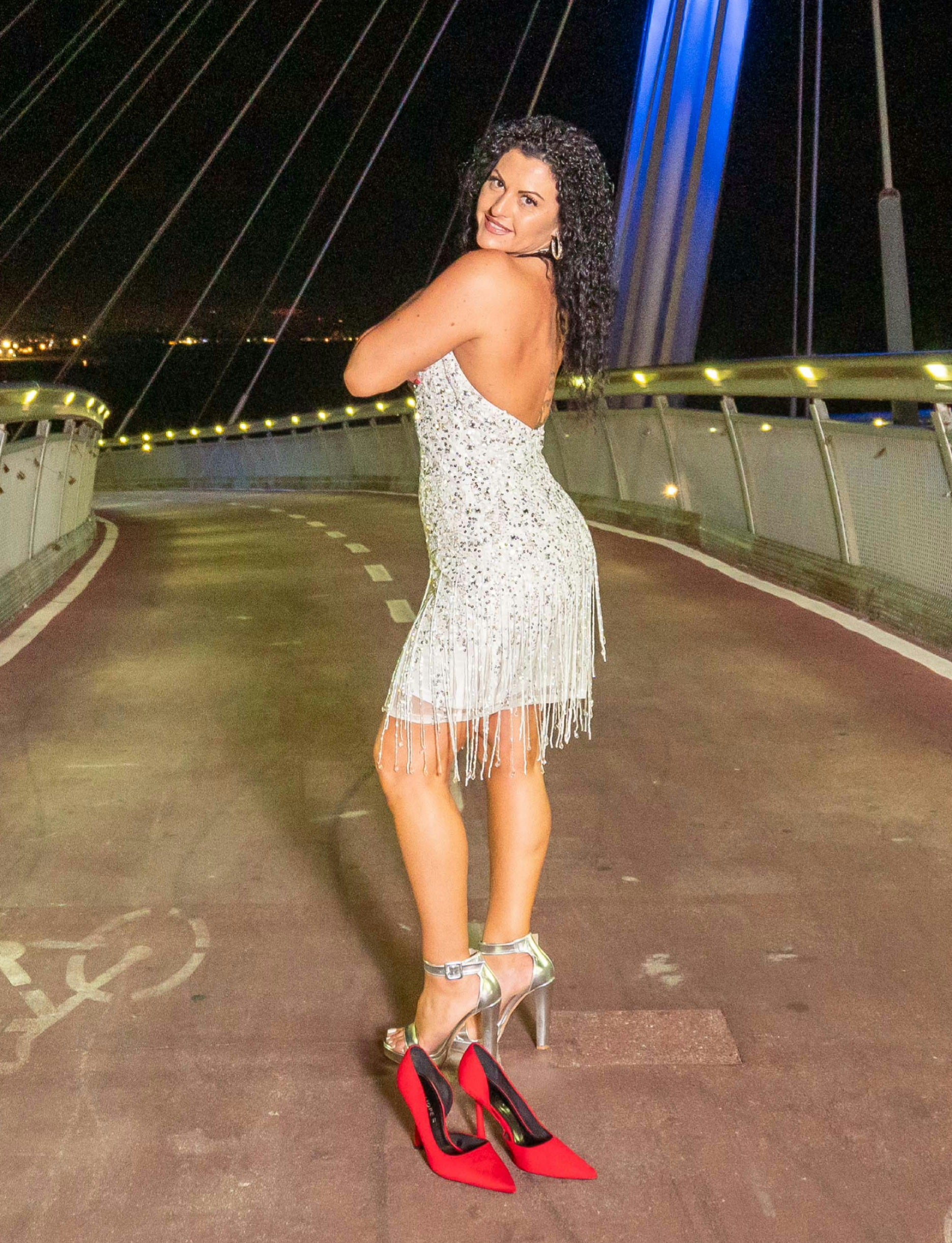 ๐Abito bianco con perline paillettes e frangie, schiena scoperta