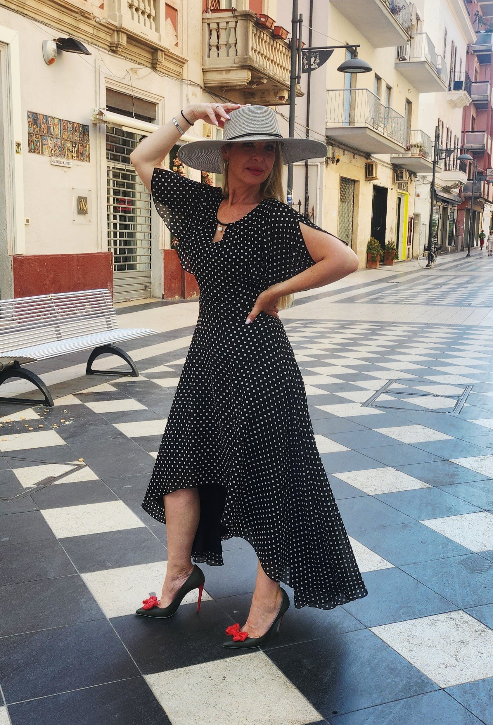 Abito nero con pois bianchi asimmetrico a 3/4 con manichetta svolazzante con spacco. L' abito, stile Dolce Vita, è più corto davanti, sotto al ginocchio e più lungo dietro, fino alla caviglia.
