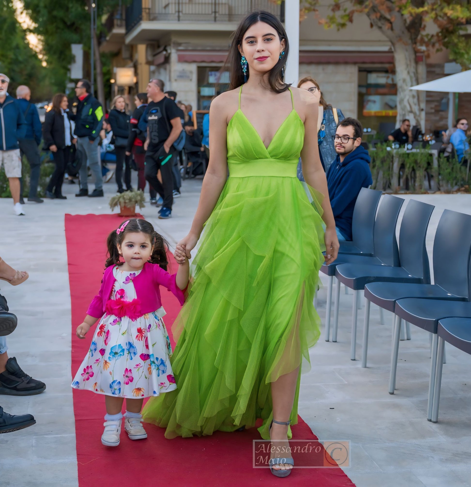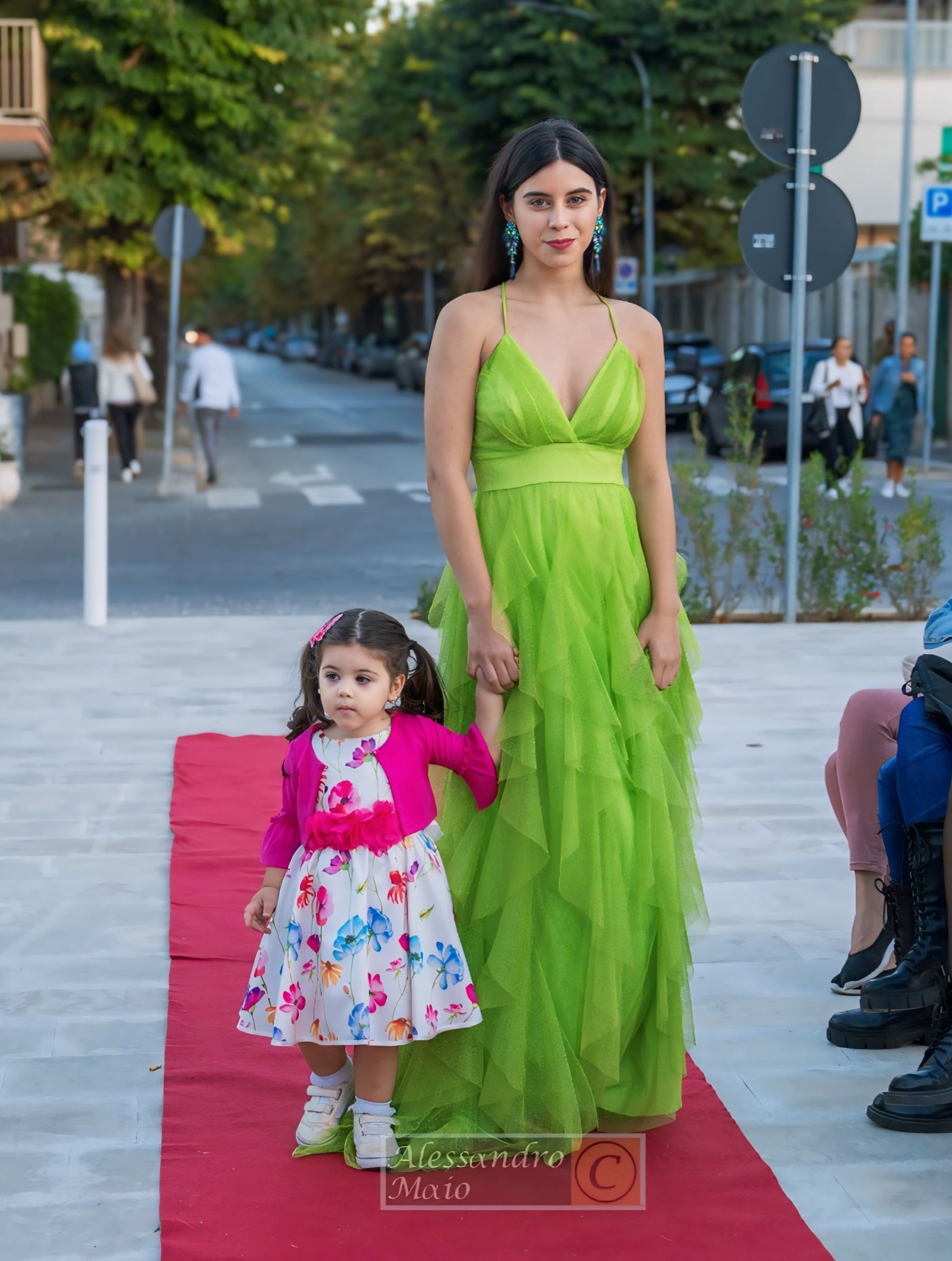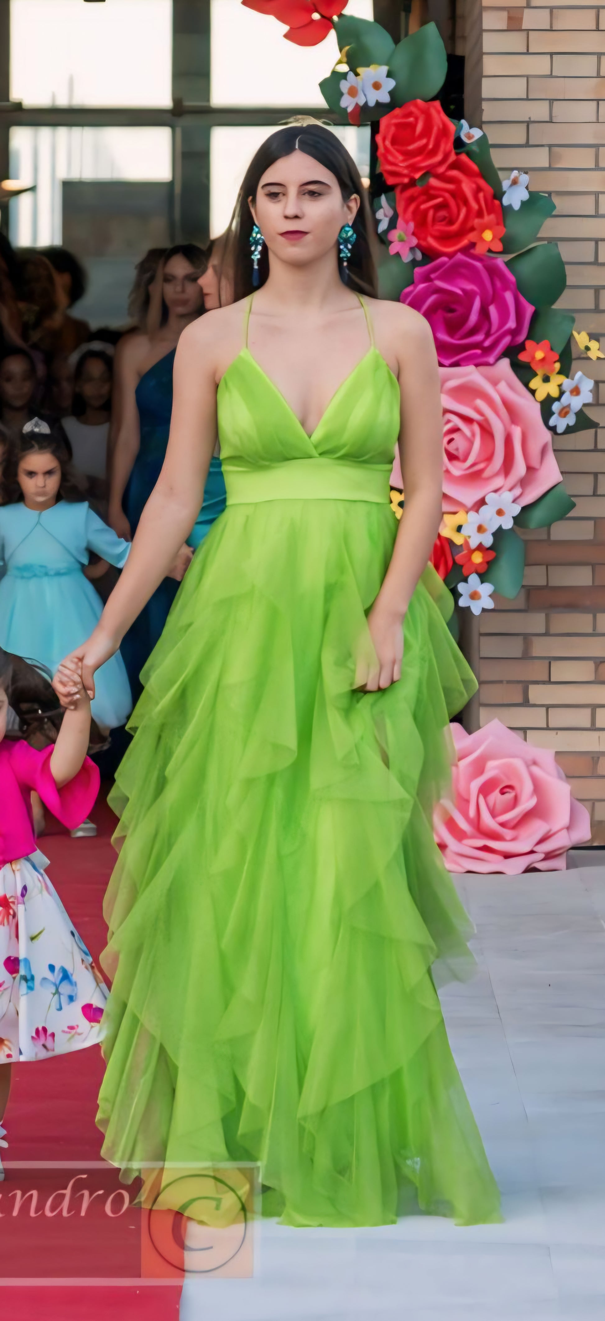 🥻Abito lungo cerimonia verde lime con volants in tulle leggermente glitterato, piccolo spacco sulla gamba sinistra, e spalline incrociate sulla schiena.