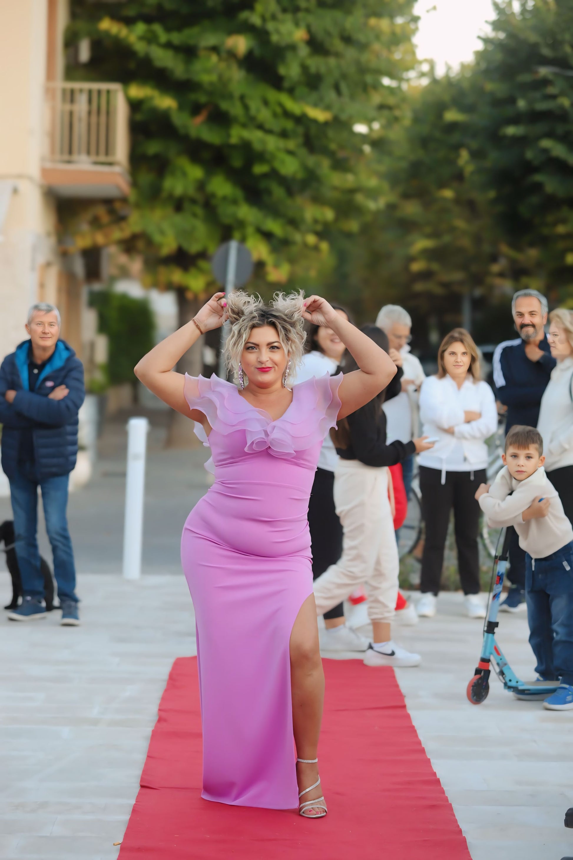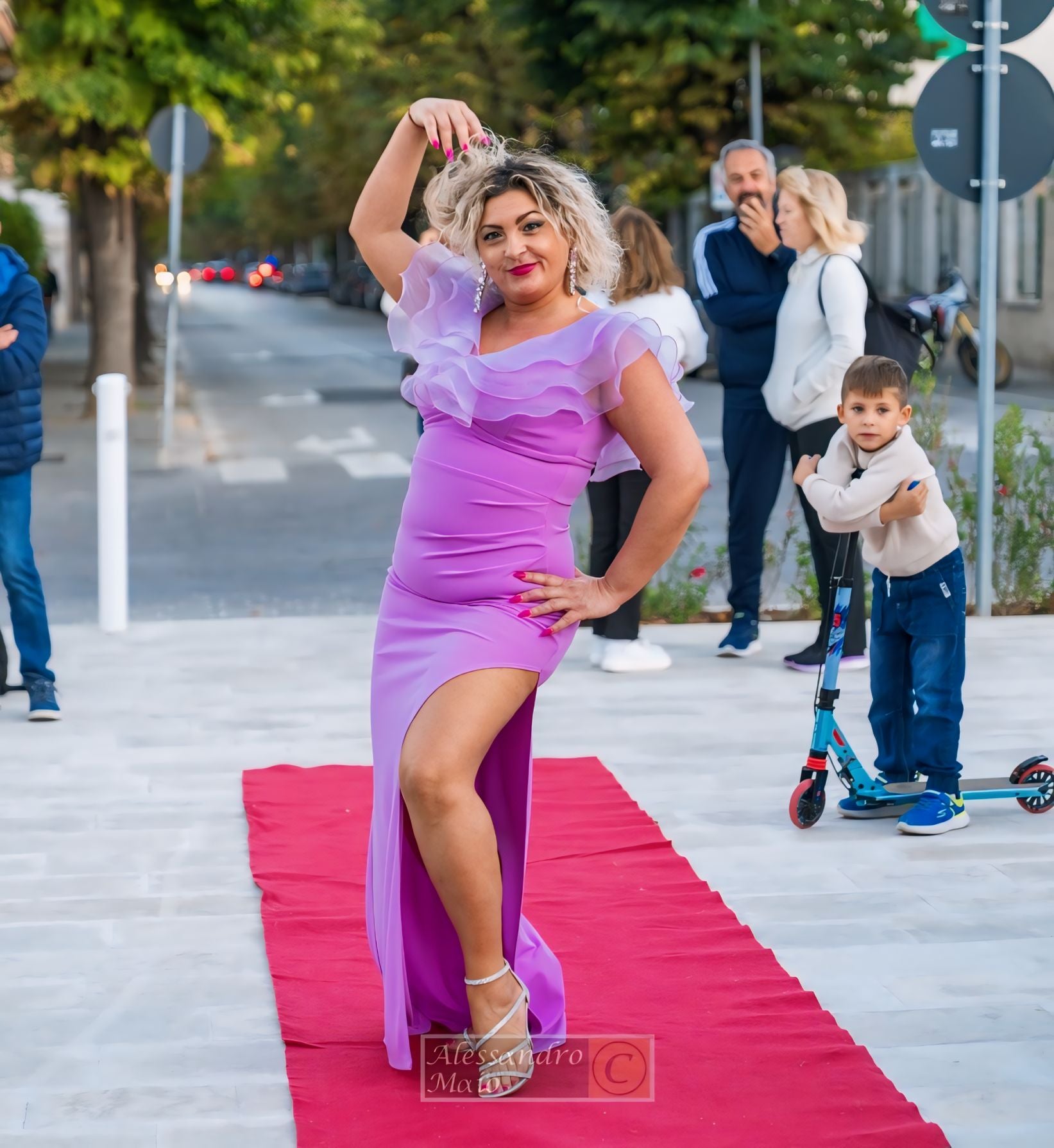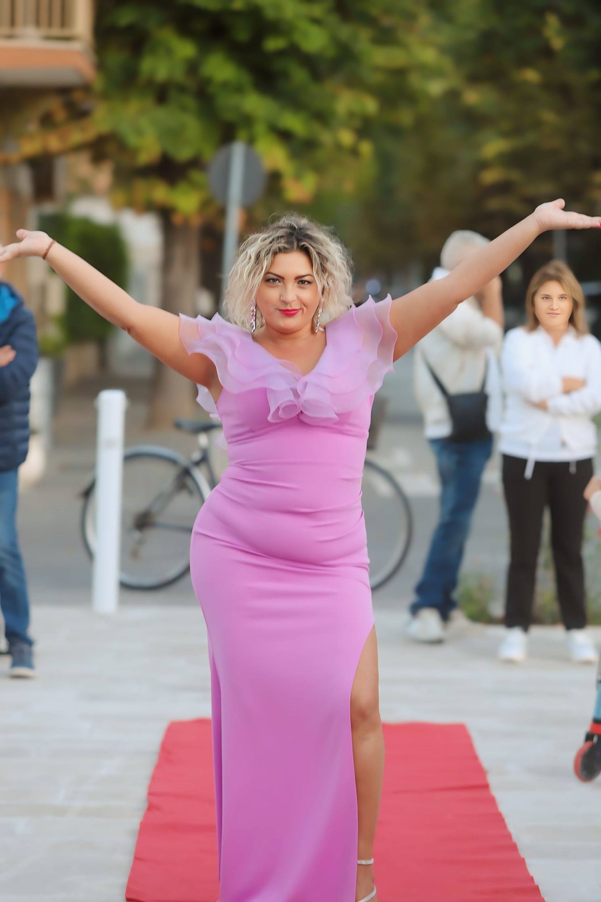 Abito lilla elasticizzato con scollo a V accentuato con volant in organza, spacco laterale.