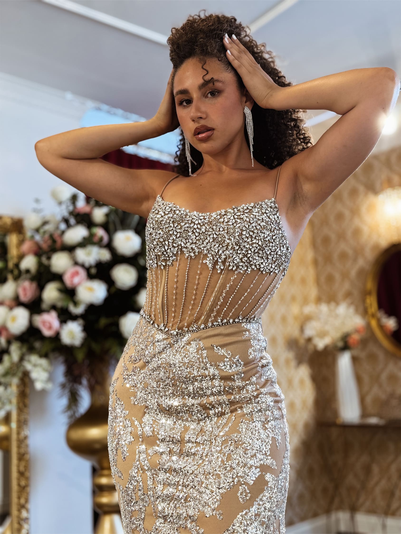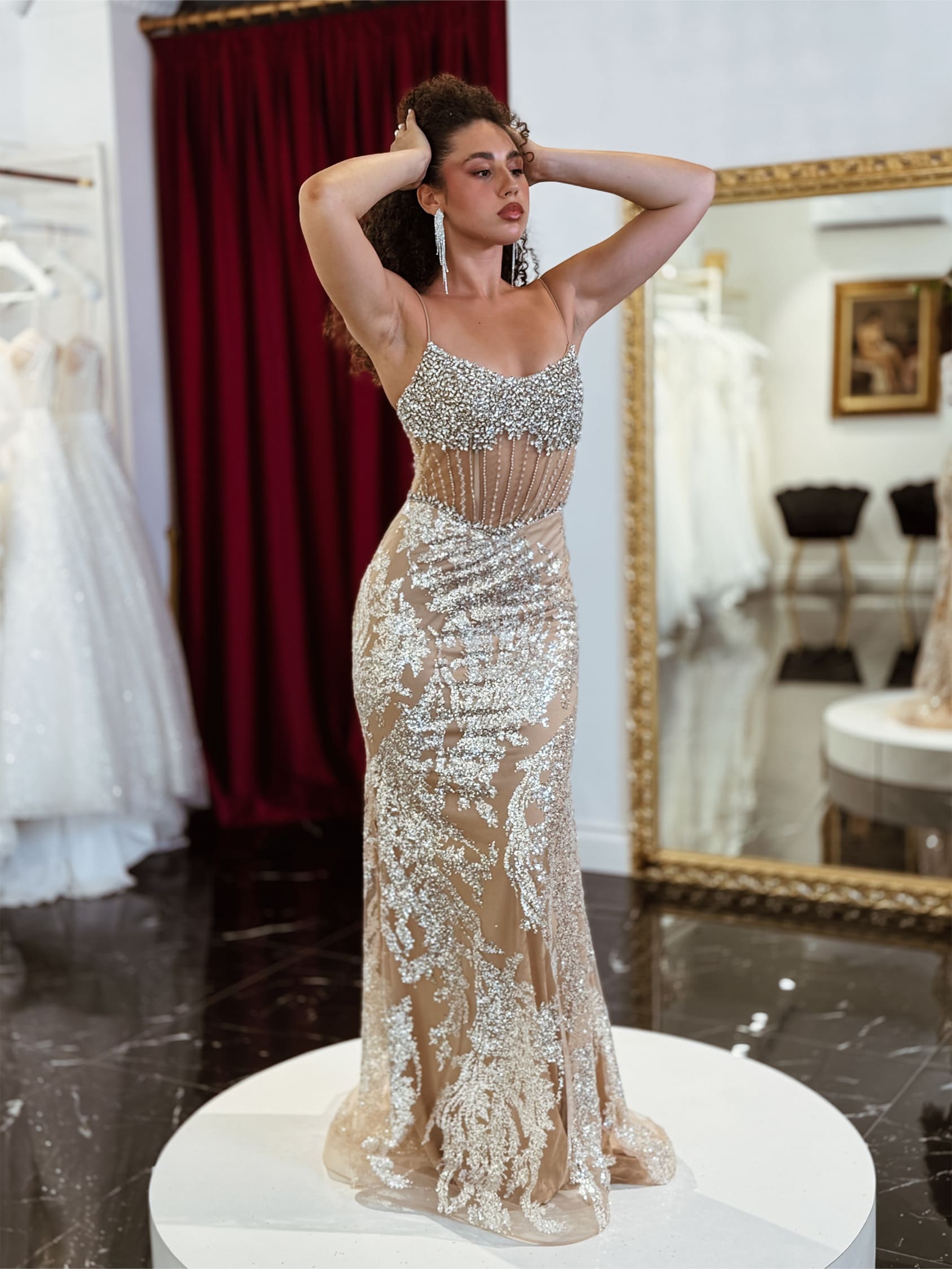 Modello: Un abito che incanta al primo sguardo, pensato per chi non vuole passare inosservata. Malafemmena è un modello a sirena con spalline sottilissime e corpetto semi-rigido, interamente ricamato con micro-cristalli e perline argentate che creano un effetto gioiello su tutta la superficie. Il busto è strutturato con stecche leggere e inserti in tulle trasparente che disegnano il punto vita e valorizzano la silhouette in modo audace ma raffinato.