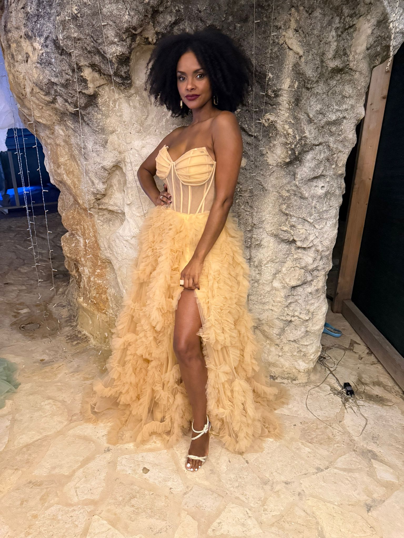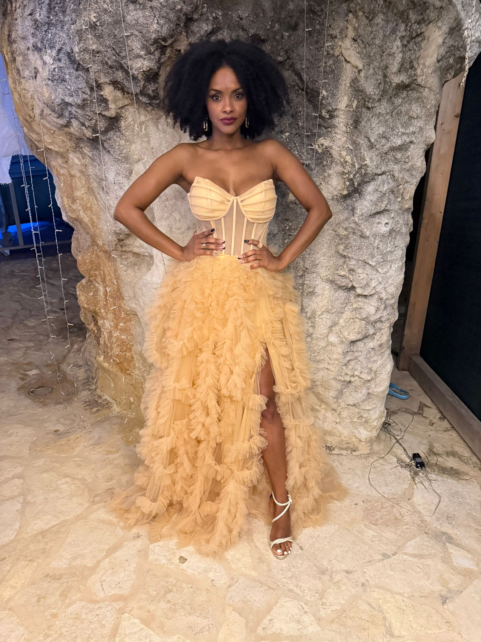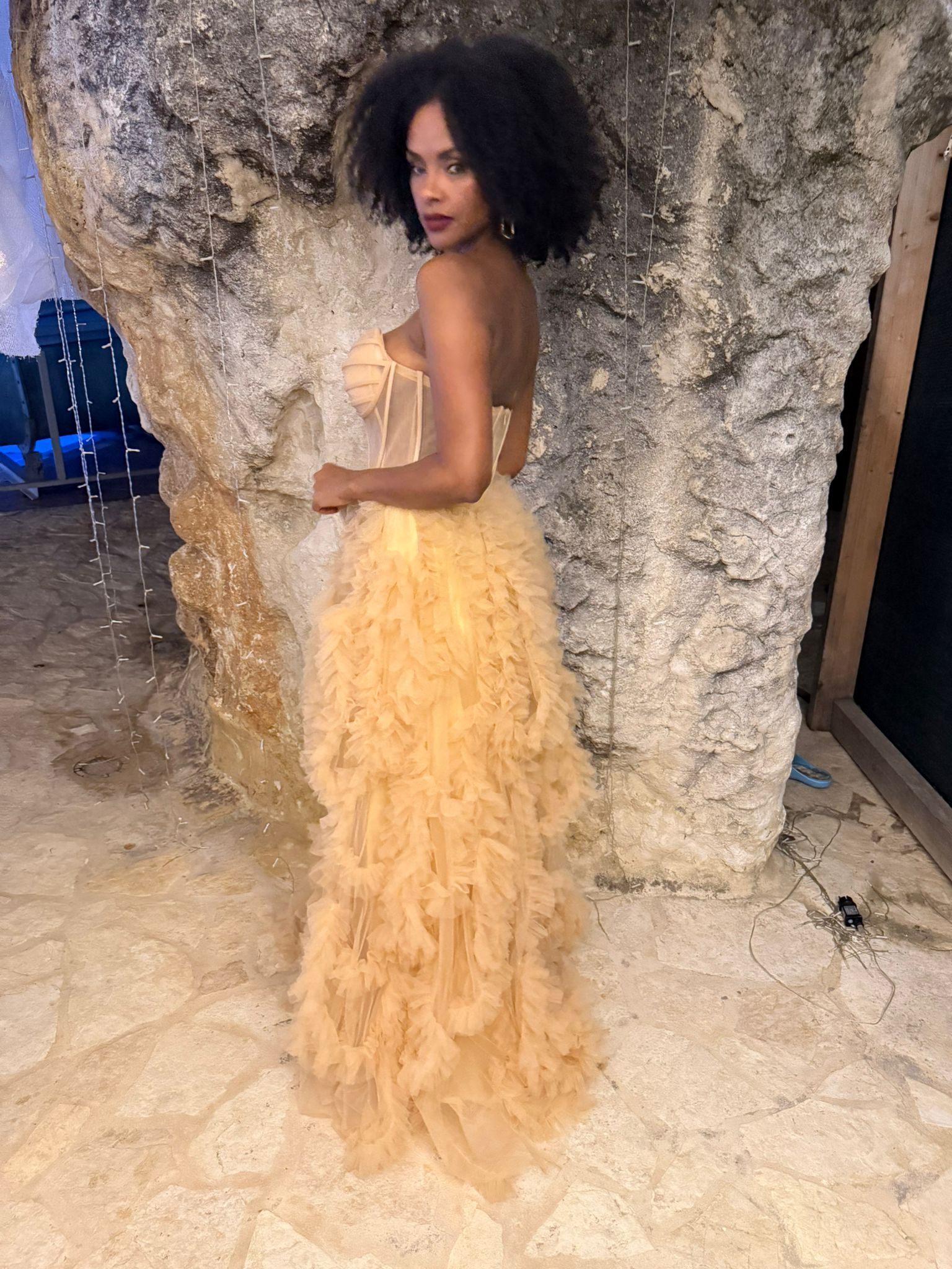 Modello: Un abito scenico e ricco di movimento, definito da un corpetto strutturato con stecche a vista e una scollatura a cuore che valorizza la figura. La gonna ampia, composta da strati di rouches leggere, si apre in uno spacco profondo che aggiunge sensualità e carattere. Una scelta decisa per chi desidera distinguersi.