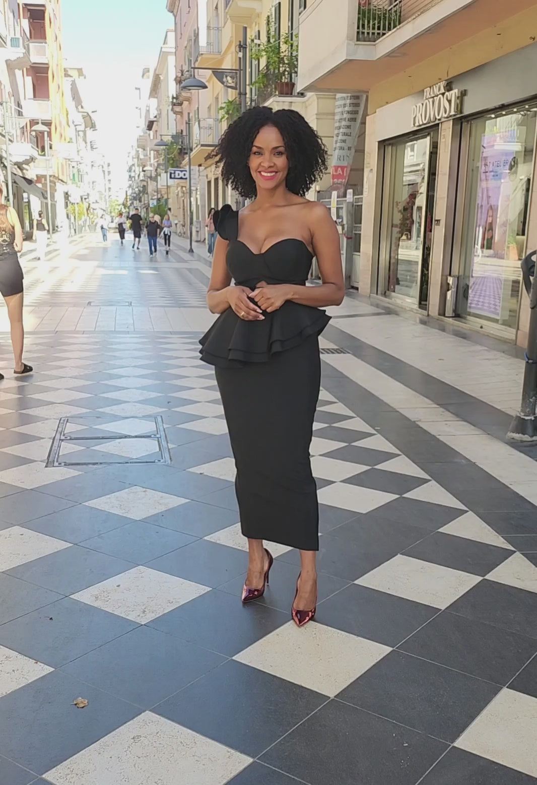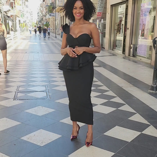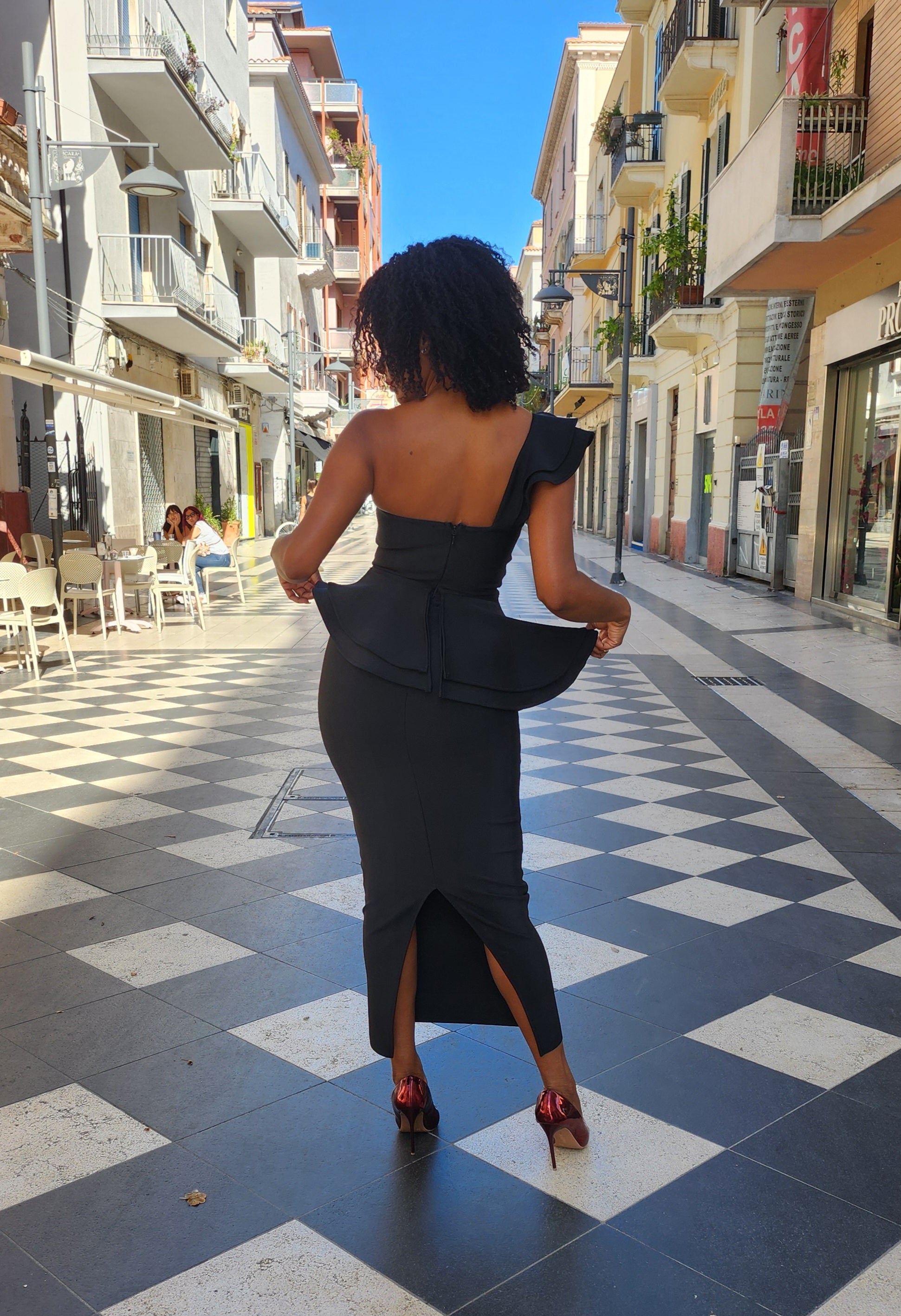 ๐ Abito nero bandage longuette monospalla con coppe preformate, e volant sul semivita