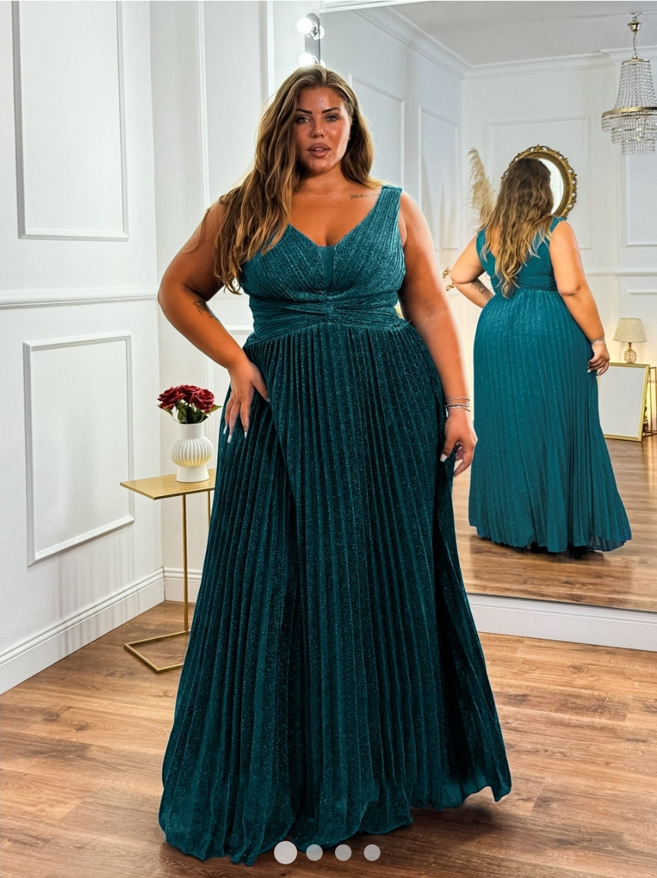 Modello: Abito in tessuto plissé con spalline larghe, caratterizzato da una scollatura a V profonda e una fascia in vita che si intreccia elegantemente formando un nodo centrale. Il design avvolgente e scultoreo esalta il punto vita, mentre la gonna morbida e fluente scivola delicatamente senza segnare le forme, garantendo un look sofisticato e armonioso