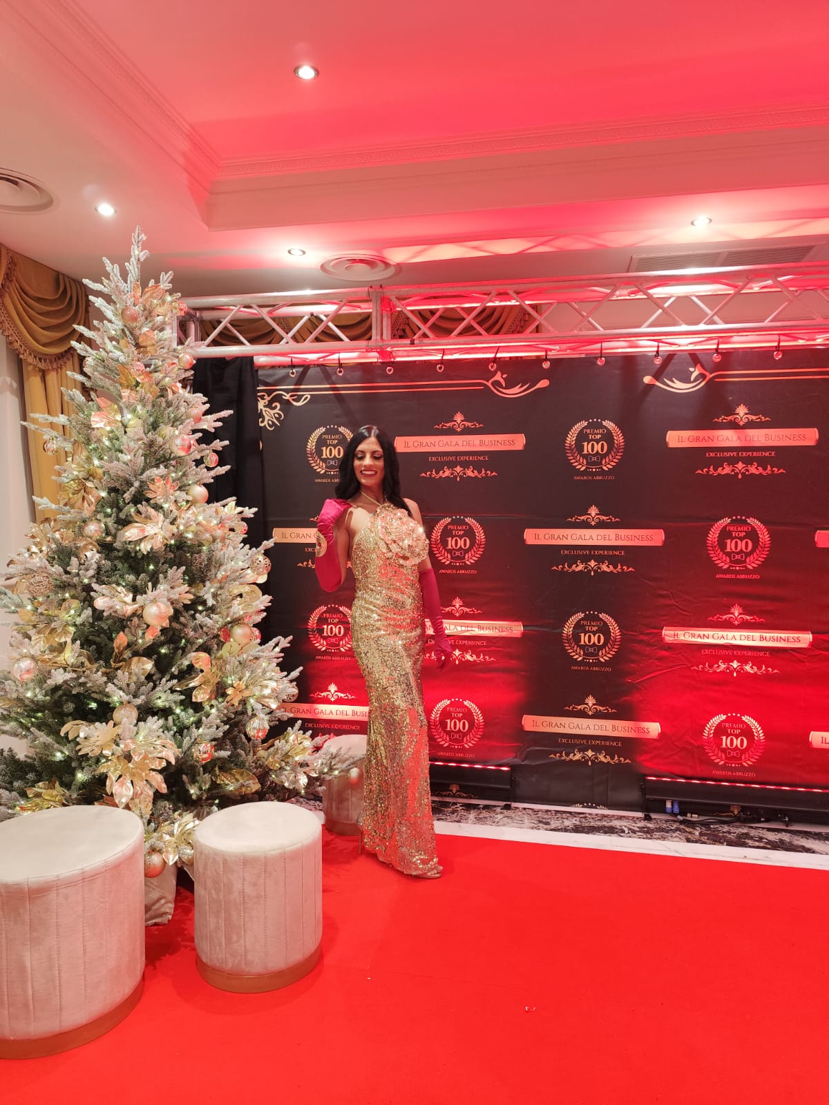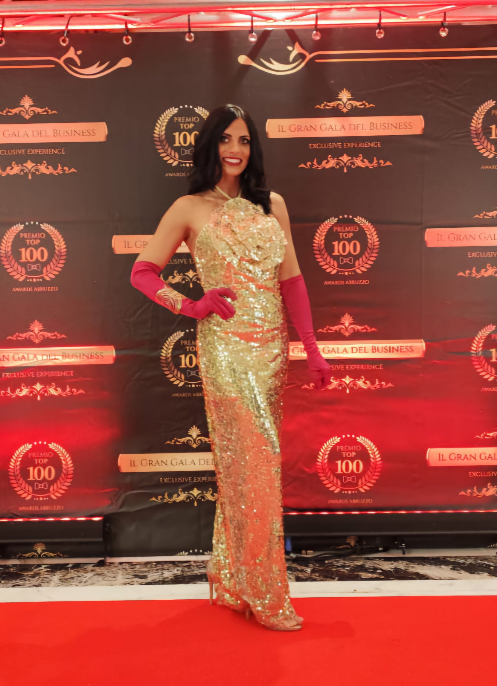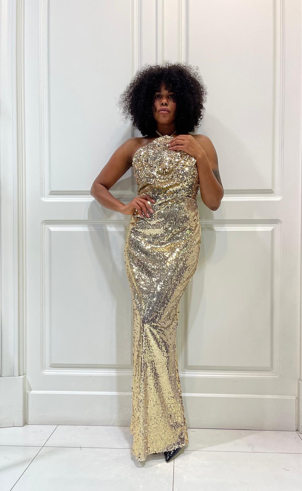 🥻 Abito sirena in paillettes oro, scollo all' americana con grande rosa oro, spacco sul retro.