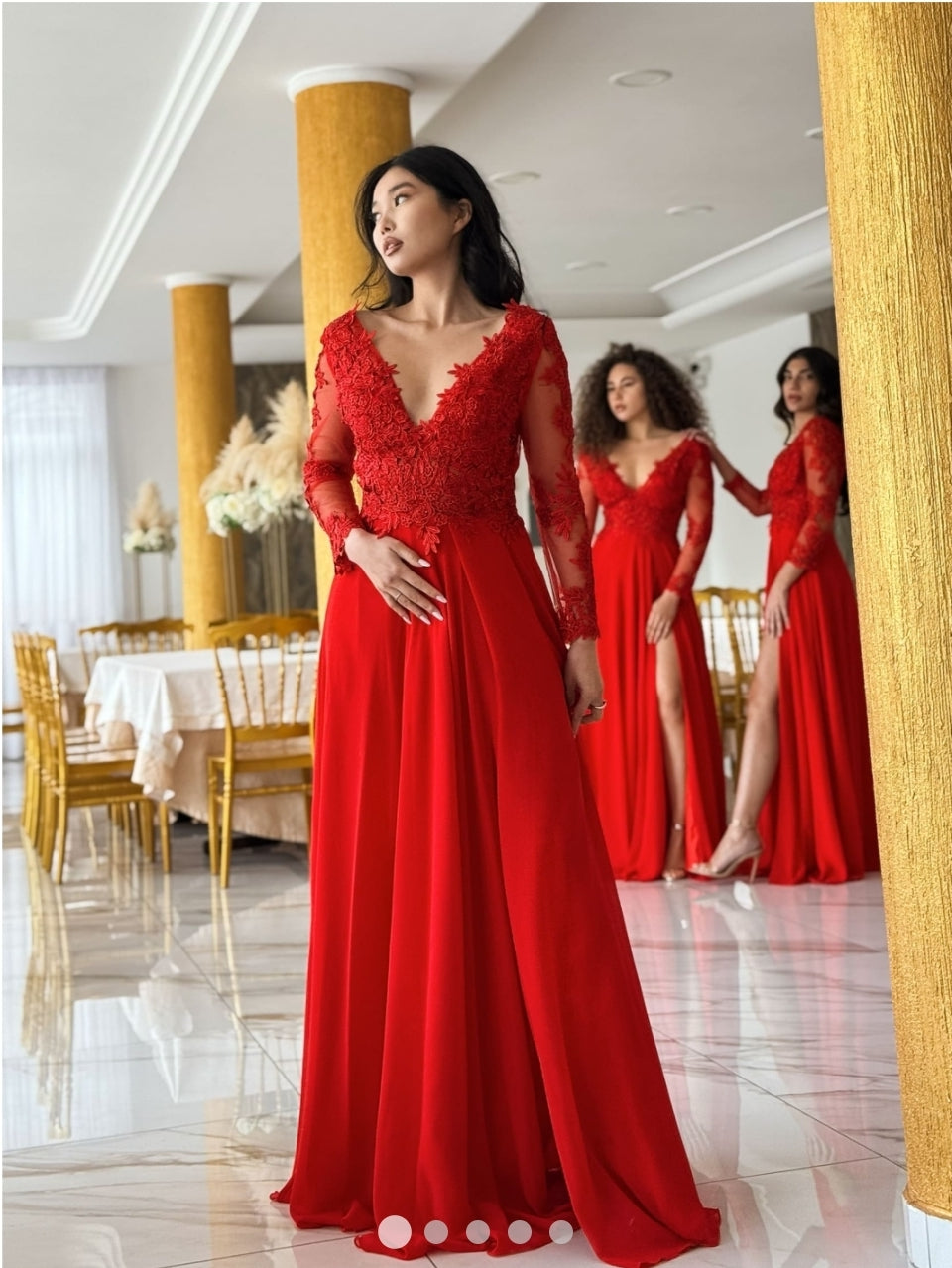 Modello: Abito lungo con corpetto in pizzo con coppe preformate e con doppia manica. Scollatura profonda sia sul davanti che sulla schiena a V e gonna in chiffon che parte dalla vita alta e presenta uno spacco laterale su una gamba molto profondo