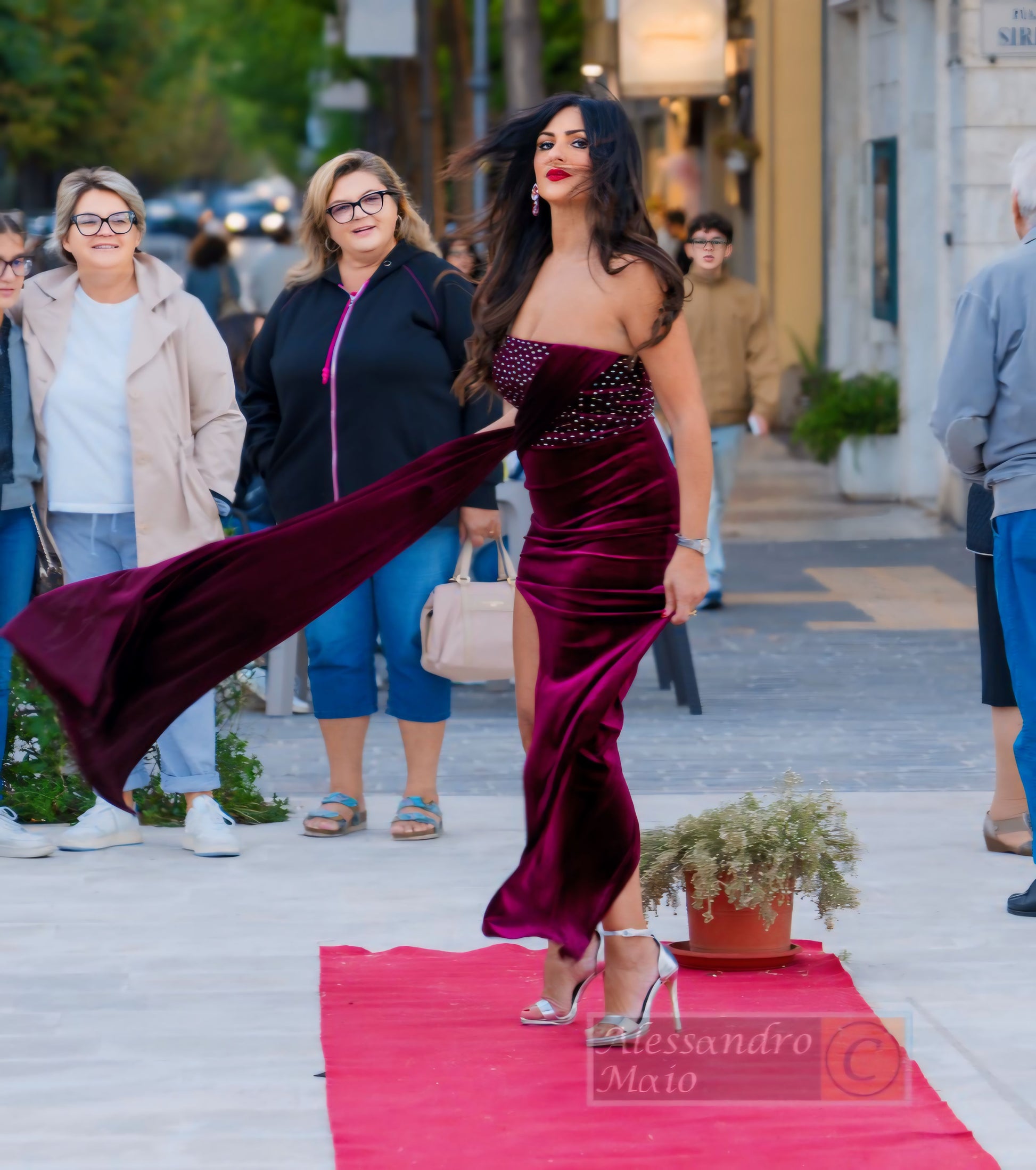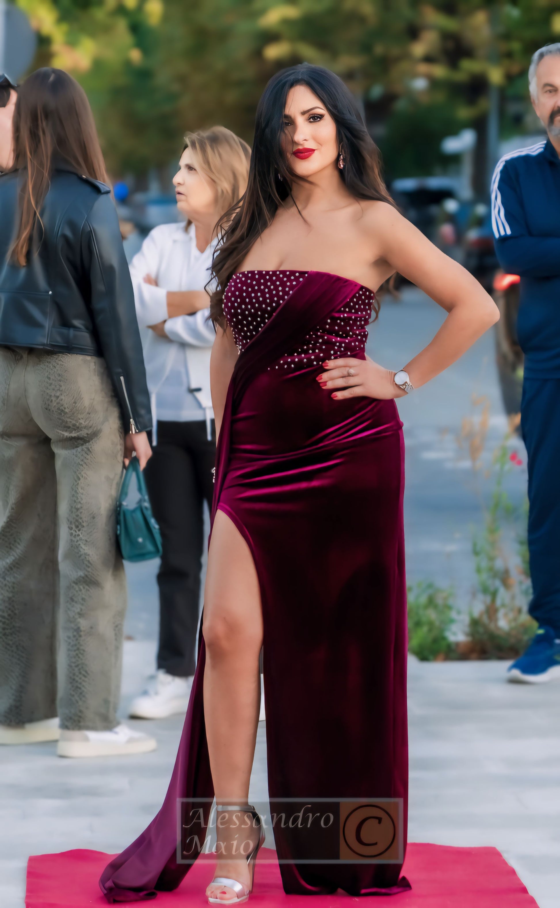 🥻Abito sirena in Velluto pregiato bordeaux, corsetto taglio seno lavorato e arricchito da strass argento, ampio spacco sul lato destro con lunga fusciacca.
