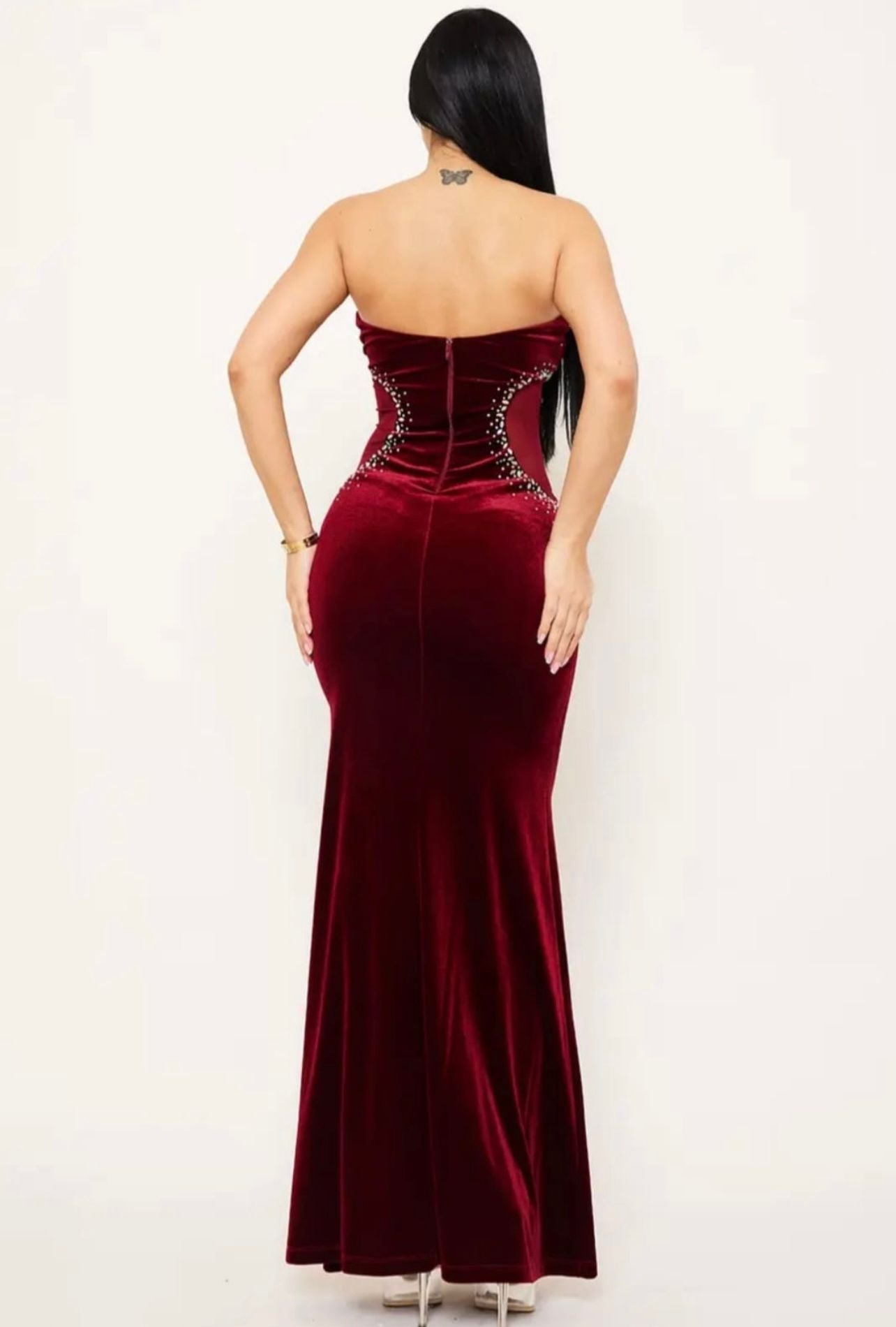 🥻 Abito sirena in Velluto pregiato color bordeaux brillante, taglio seno con scollatura profonda a V con ferretto tutta tempestata di strass argento. Doppi oblò trasparenti sui fianchi sempre ricamati con strass.