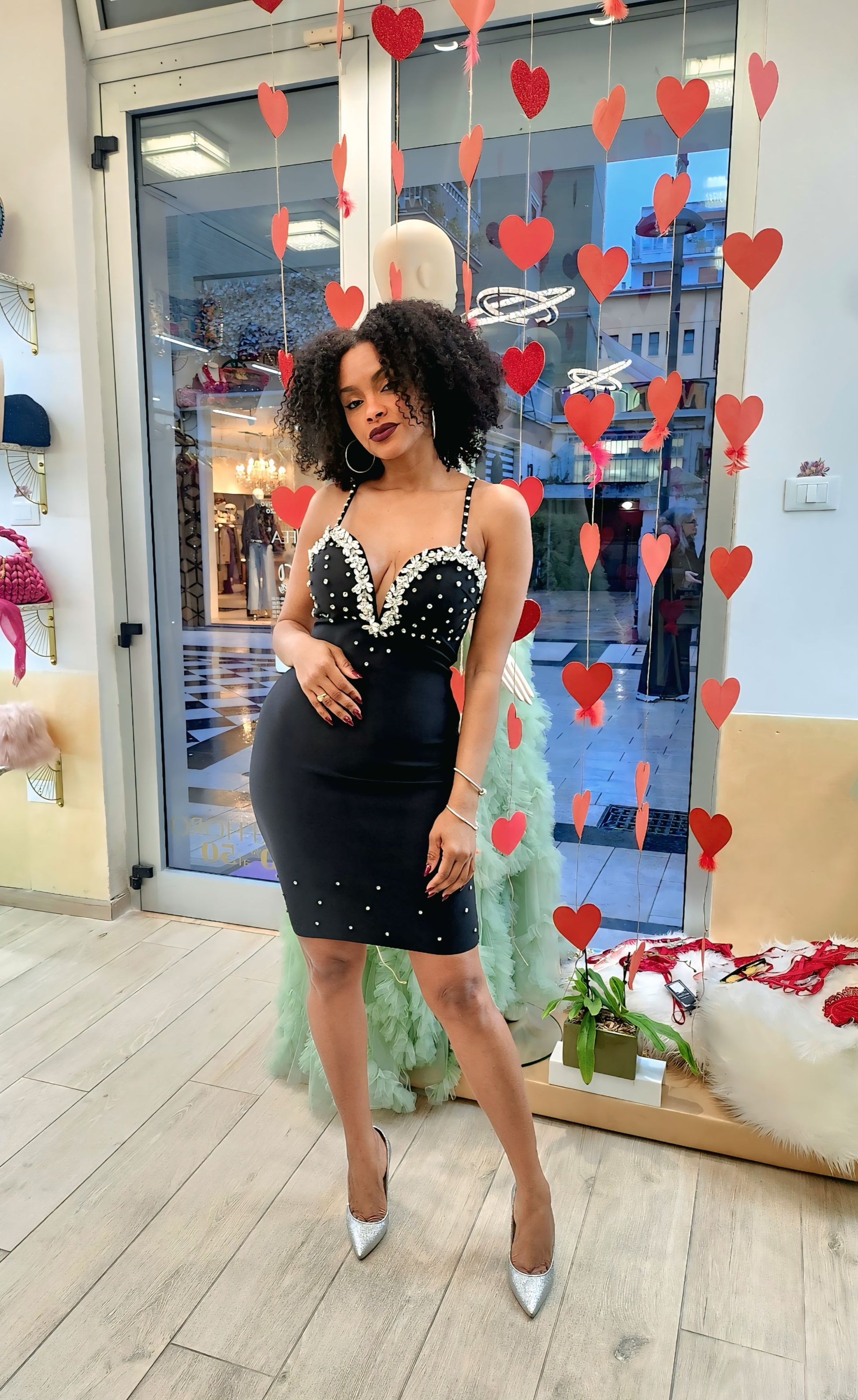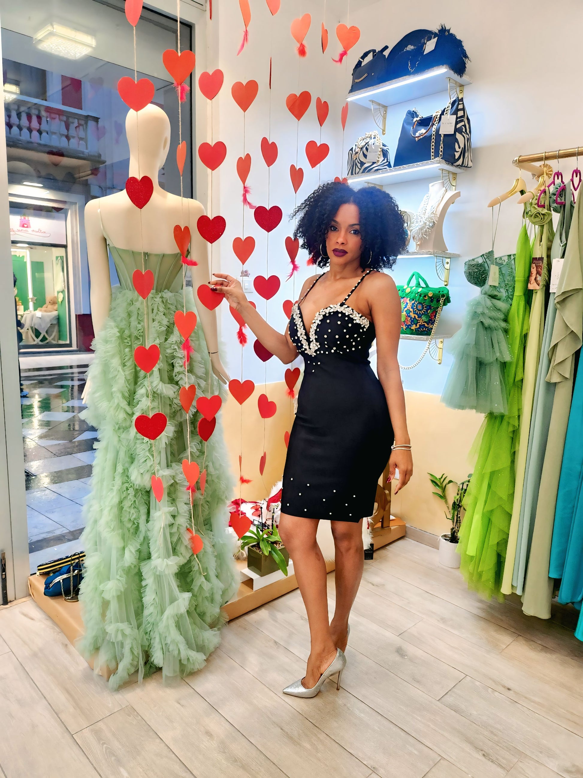 👗Abito nero bandage longuette con strass e perline sullo scollo, sulla gonna e sulle spalline fini, adatto per una serata elegante.