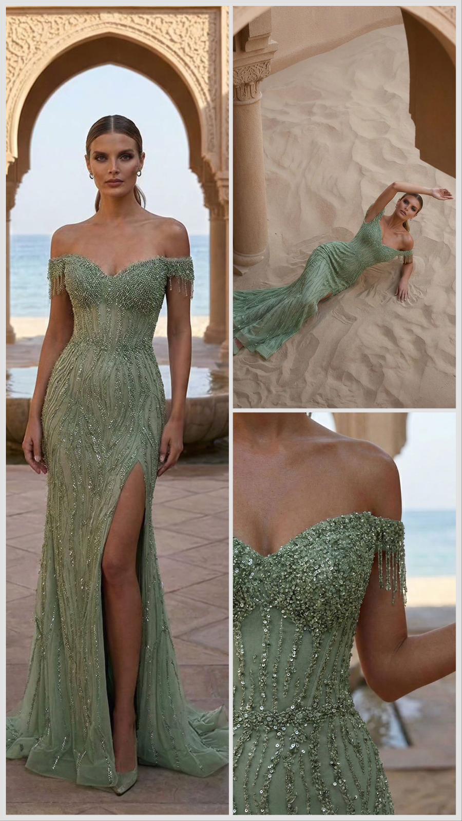 Un abito che si distingue per la sua straordinaria unicità. Decorato con paillettes e perline per un effetto brillante, con uno spacco che aggiunge un tocco di magia al movimento