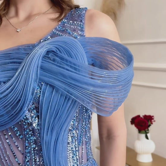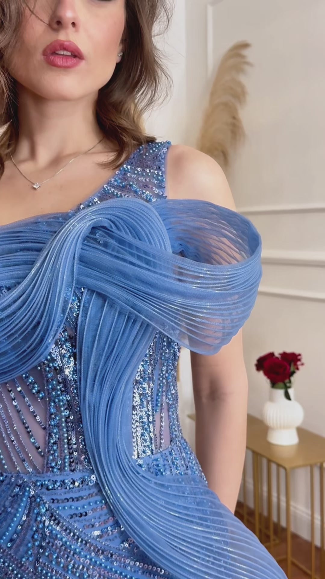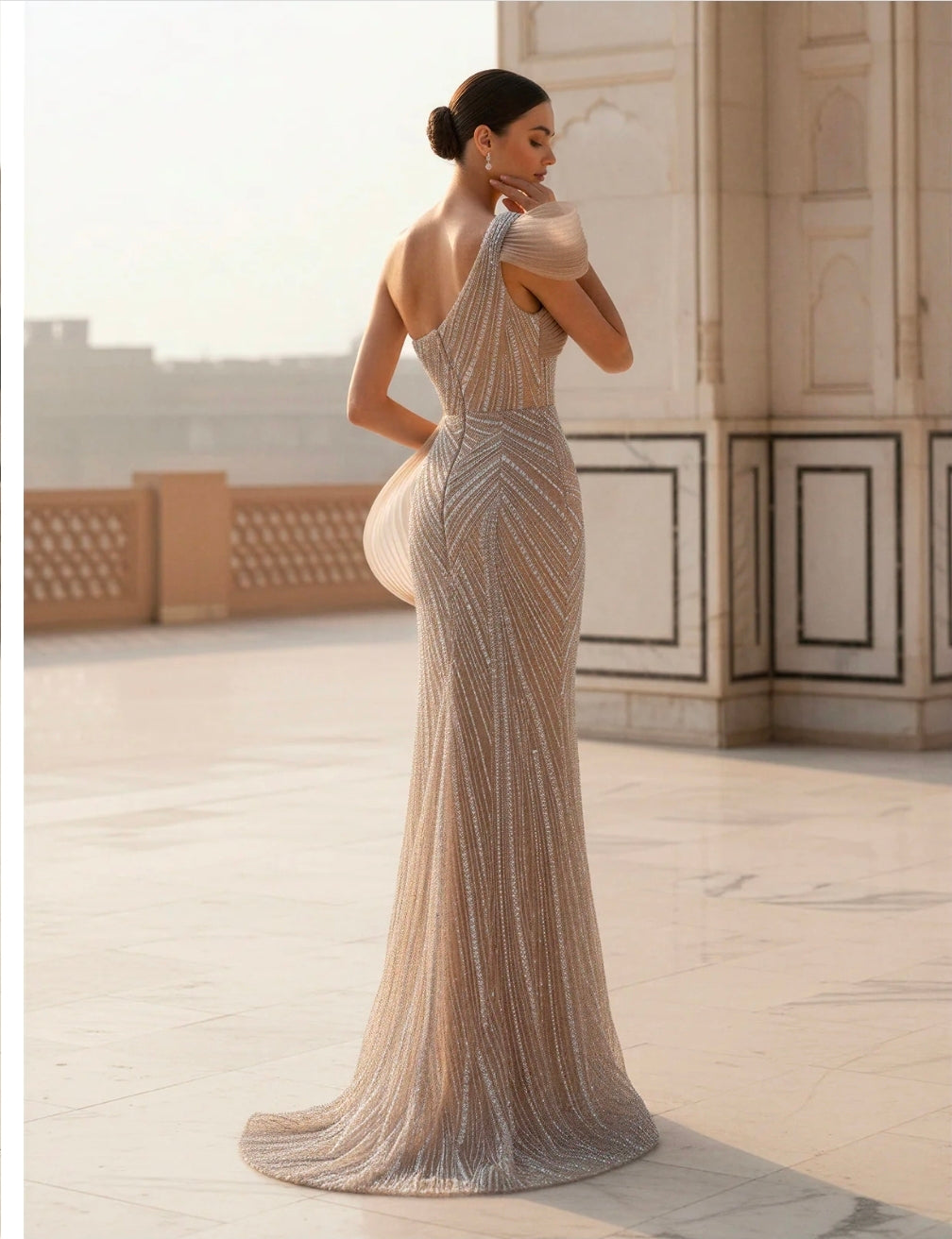 Modello: Abito modello sirena è pensato per valorizzare la figura con una linea decisa, sensuale e sofisticata. Il taglio aderente segue le forme in modo naturale, slanciando la silhouette e accompagnando il corpo fino all'orlo con eleganza. Il design monospalla è il tratto distintivo del modello: il drappeggio morbido che avvolge il busto crea un raffinato gioco di volumi, mentre l'applicazione strutturata sulla spalla dona carattere e unicità all'abito. Il corpino è impreziosito da una lavorazione luminosa che cattura la luce con discrezione, rendendo il capo ideale per eventi serali e occasioni formali. La gonna lunga presenta uno spacco laterale, studiato per garantire libertà di movimento e aggiungere un tocco contemporaneo al look. Il tessuto leggero e fluido accompagna ogni passo con naturalezza, mantenendo una vestibilità confortevole pur rimanendo estremamente elegante. Un abito da cerimonia scenografico e moderno, perfetto per chi desidera distinguersi con stile in eventi esclusivi, matrimoni, gala e serate di rappresentanza.