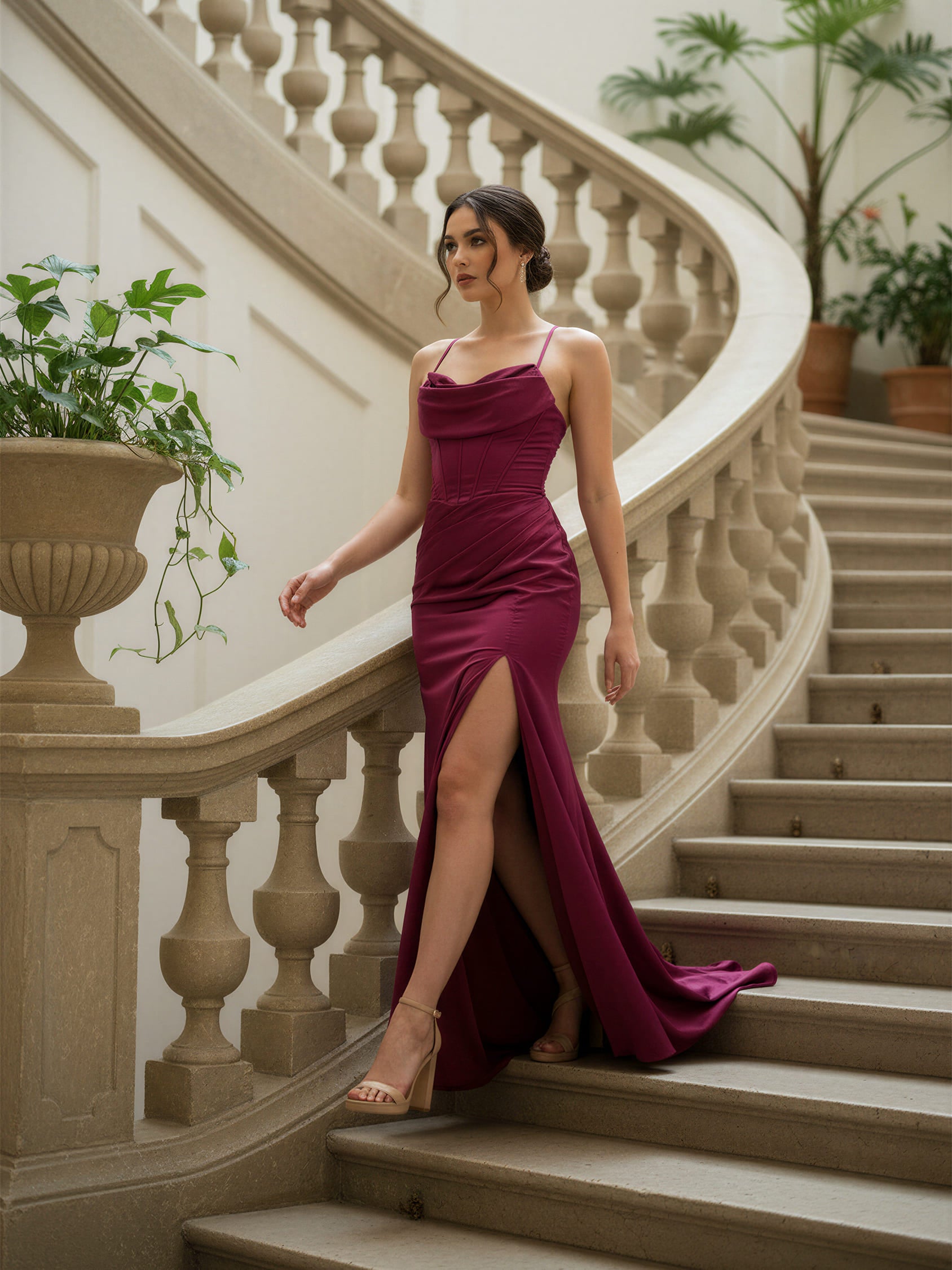 🥻Modello: Abito lungo a sirena, il corpetto, con scollo a cascata su base a cuore, crea un effetto morbido e raffinato che valorizza il décolleté, mentre le spalline sottili intrecciate aggiungono un tocco delicato e moderno. La struttura del bustier è definita da stecche leggere che scolpiscono la silhouette e sottolineano il punto vita, per poi aprirsi in una gonna lunga con drappeggio laterale e spacco profondo che slancia la figura e dona movimento. Realizzato in satin elasticizzato, l’abito aderisce al corpo con naturalezza senza rinunciare al comfort. La lucentezza del tessuto esalta le curve con un effetto setoso e sofisticato, perfetto per cerimonie, eventi serali o red carpet.